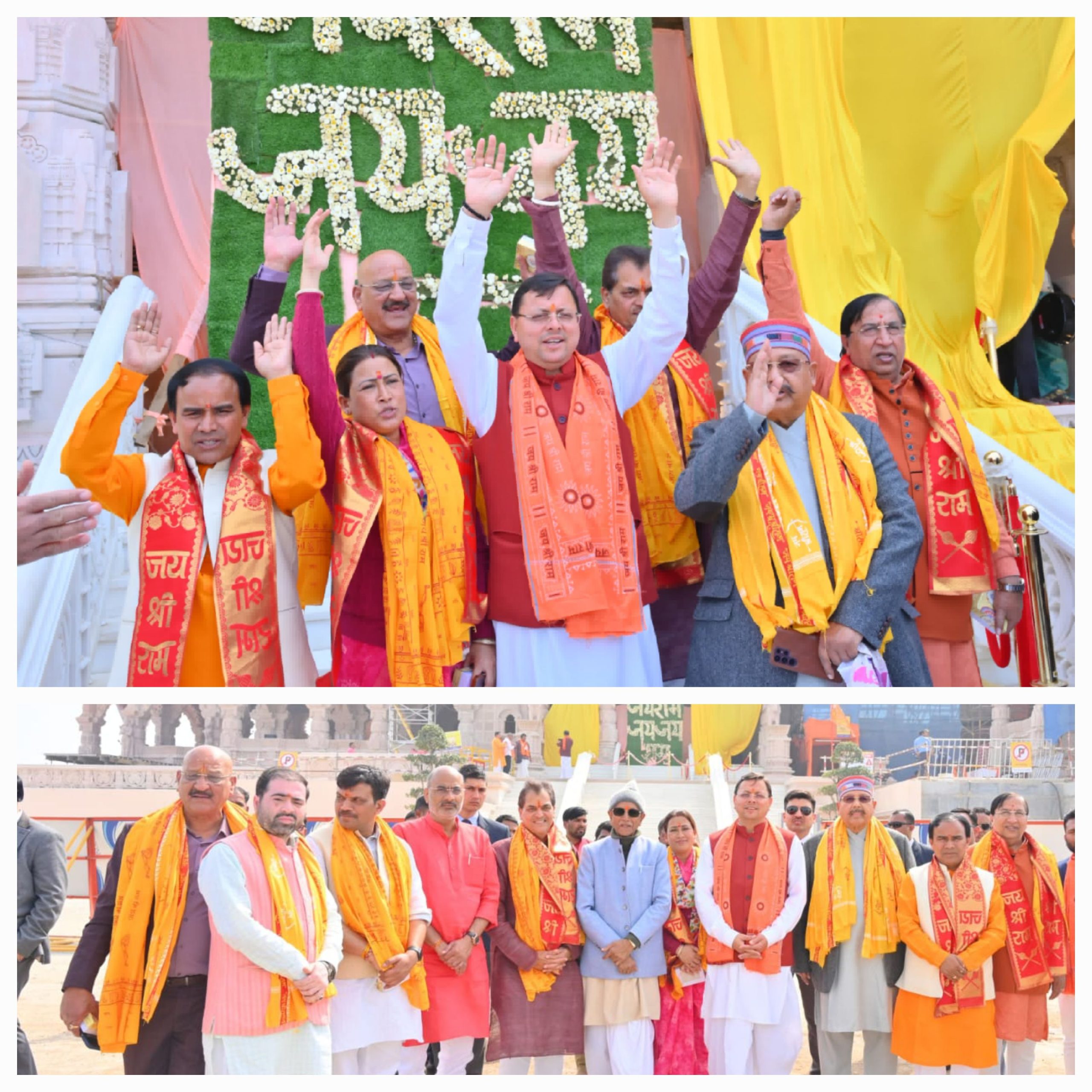 मुख्यमंत्री पुष्कर सिंह धामी मंत्रिमंडल में अपने सहयोगियों सतपाल महाराज, प्रेमचंद अग्रवाल, सुबोध उनियाल, डॉ धन सिंह रावत, रेखा आर्य एवं राज्यसभा सांसद नरेश बंसल के साथ जॉलीग्रांट एयरपोर्ट पहुंचे, जहां से वे अयोध्या धाम के लिए रवाना हुए। अयोध्या में महर्षि वाल्मीकि अंतरराष्ट्रीय हवाई अड्डा में पहुंचे पर मुख्यमंत्री धामी और उनके सहयोगियों का भव्य स्वागत हुआ। इस दौरान पूरा परिसर जय श्रीराम के नारों से गूंज उठा। यहां से वह राम जन्मभूमि के लिए रवाना हुए। मुख्यमंत्री एवं उनके सहयोगी श्री अयोध्या धाम में प्रभु राम को साष्टांग नमन कर पूजा अर्चना की। दर्शन करने के बाद मुख्यमंत्री श्री पुष्कर सिंह धामी भावुक हो गए। मुख्यमंत्री ने कहा कि श्री रामलला के दर्शन से रोम-रोम भक्तिमय और मन प्रफुल्लित है। उन्होंने कहा कि रामलला को कई वर्षों तक टेंट में रहना पड़ा। आज भव्य मंदिर में रामलाला के दर्शन किए। मैं भाव विह्वल हूं और प्रभु श्रीराम के चरणों में समर्पित हूं।