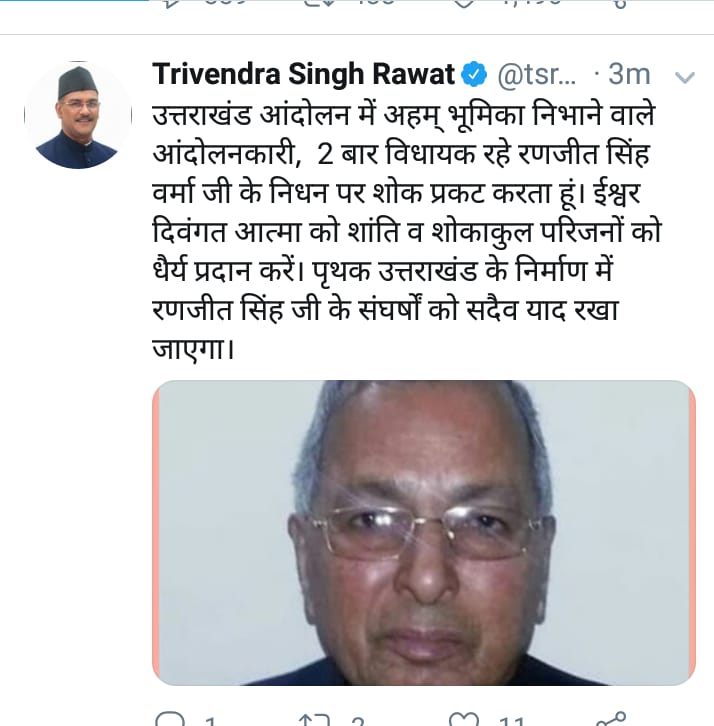 दुःखद खबर है आपको बता दे कि उत्तराखंड के पूर्व विधायक रणजीत सिंह वर्मा जी अब हमारे बीच नही रहे सोमवार को उनका निधन हो गया दुःखद