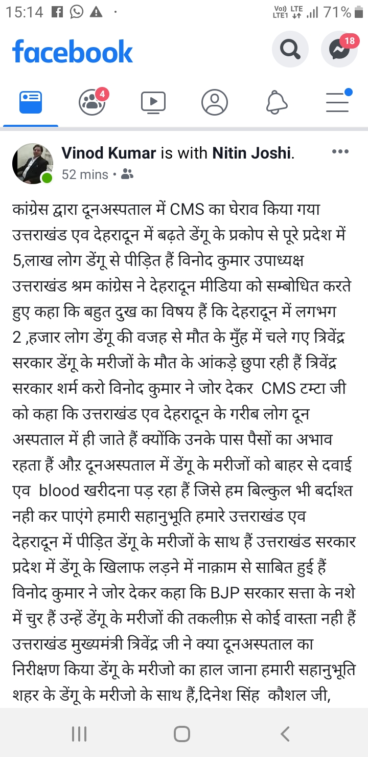 उत्तराखंड मैं डेंगू को लेकर अब हर कोई त्रिवेंद्र सरकार को घेरने मैं लगा हुवा कारण साफ है विपक्ष मैं बैठी कांग्रेस को स्वास्थ्य महकमे के द्वारा दिये जा रहे डेंगू के आंकड़े गलत नज़र आ रहे है जिस पर अब उपवास से लेकर धरने तक भी कांग्रेस करती नज़र आ रही हैं