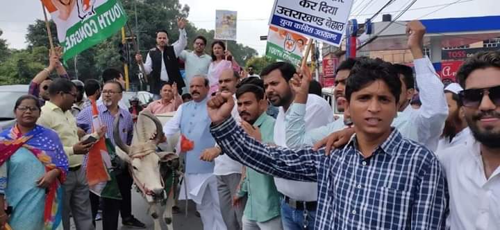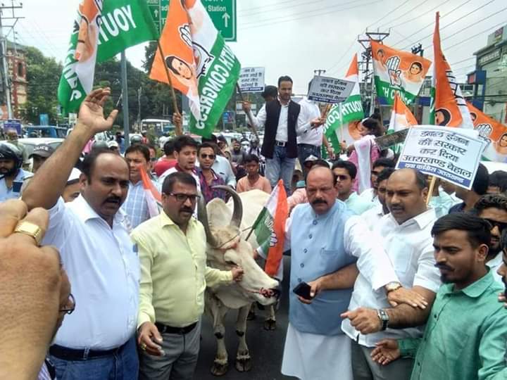 मोटर व्हीकल एक्ट के खिलाफ कांग्रेस ने देहरादून की सड़कों पर उतारी बैलगाड़ी