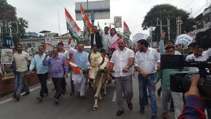 ओर तब ये कांग्रेस के कार्यकर्ता बैलगाड़ी लेकर सड़कों पर निकल पड़े। इस बीच उन्होंने राज्य सरकार के खिलाफ जमकर नारेबाजी भी की।