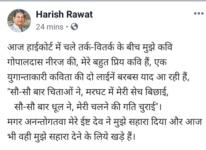 बहराल पूर्व मुख्यमंत्री हरीश रावत की इन लाइनो मैं बहुत कुछ रहस्य है जो उनसे बात कर ही मालूम चलेगा।