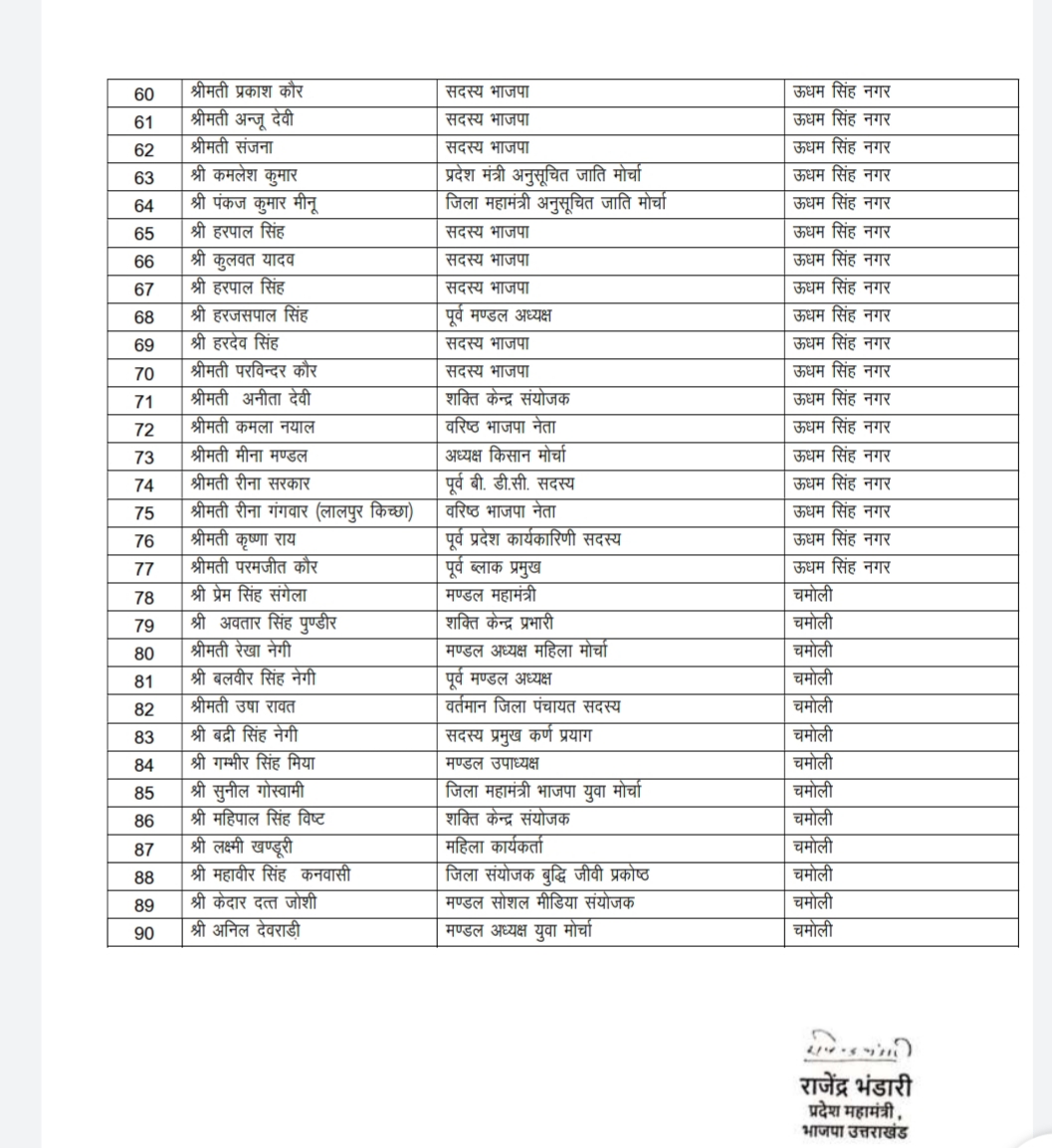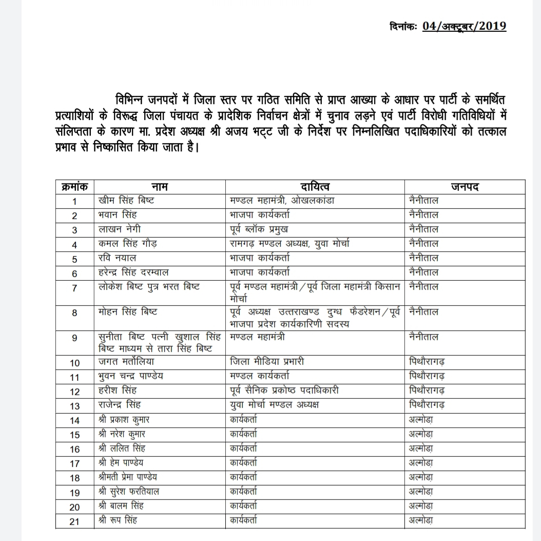 प्रदेश अध्यक्ष अजय भट्ट के निर्देश पर पूर्व घोषित 40 पदाधिकारियों व कार्यकर्त्ताओं व 50 नए पदाधिकारियों व कार्यकर्त्ताओं को पद मुक्त करने के साथ पार्टी से निष्कासित कर दिया है।