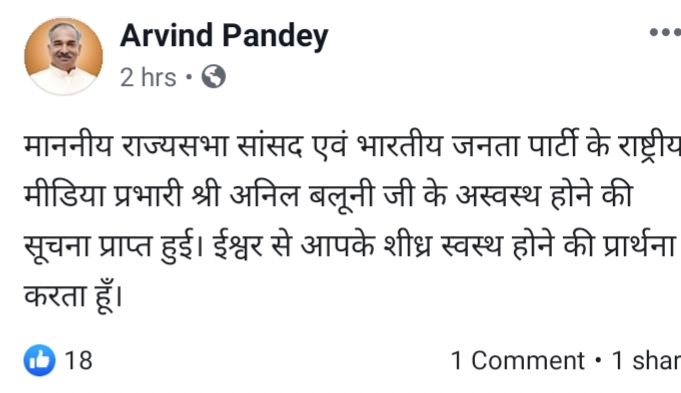 भारतीय जनता पार्टी के राष्ट्रीय मीडिया प्रमुख व उत्तराखंड से राज्यसभा सांसद अनिल बलूनी के अस्वस्थ होने की ख़बर के बाद