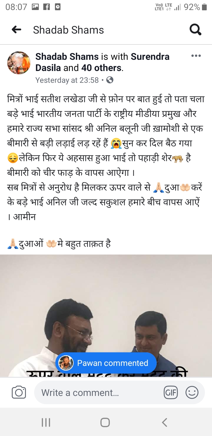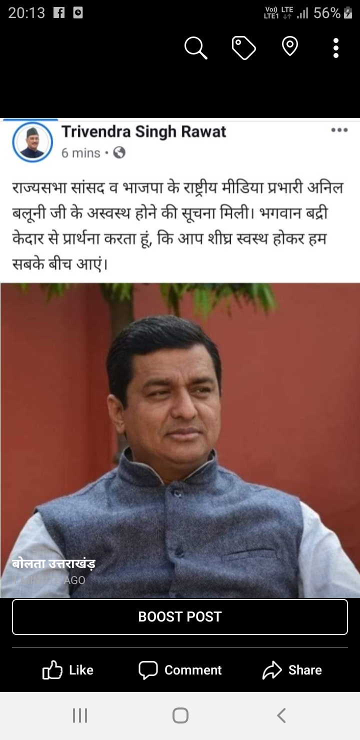 इसके साथ ही लगातार फेसबुक और अन्य सोशल मीडिया मैं भी अनिल बलूनी जी के जल्द स्वस्थ होने के लिए उनके सुभ चिंतक , भाजपा पार्टी के कार्यकर्ता , विपक्ष के नेता कामना कर रहे है।