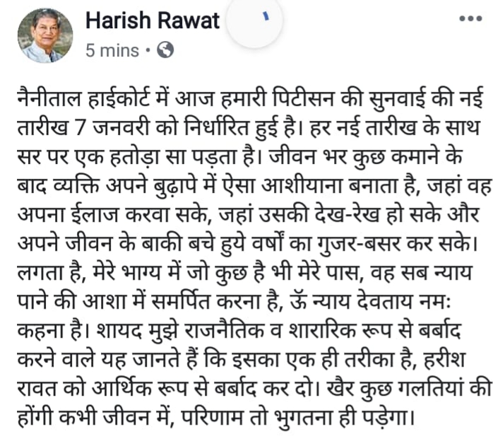 नैनीताल हाईकोर्ट में आज नई तारीख हमारी पिटीसन की सुनवाई की तिथि 7 जनवरी को निर्धारित हुई है। हर नई तारीख के साथ सर पर एक हतोड़ा सा पड़ता है। जीवन भर कुछ कमाने के बाद व्यक्ति अपने बुढ़ापे में ऐसा आशीयाना बनाता है, जहां वह अपना ईलाज करवा सके, जहां उसकी देख-रेख हो सके और अपने जीवन के बाकी बचे हुये वर्षों का गुजर-बसर कर सके। लगता है, मेरे भाग्य में जो कुछ है भी मेरे पास, वह सब न्याय पाने की आशा में समर्पित करना है, ऊॅ न्याय देवताय नमः कहना है। शायद मुझे राजनैतिक व शारारिक रूप से बर्बाद करने वाले यह जानते हैं कि इसका एक ही तरीका है, हरीश रावत को आर्थिक रूप से बर्बाद कर दो। खैर कुछ गलतियां की होंगी कभी जीवन में, परिणाम तो भुगतना ही पड़ेगा।
