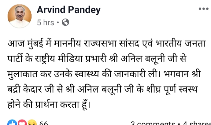 पांडे ने कहा बलूनी के स्वास्थ्य में हो रहा है सुधार