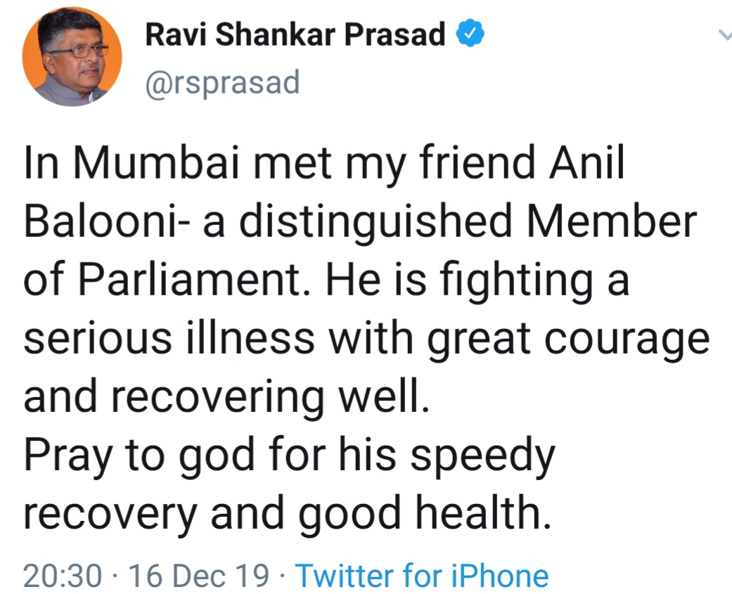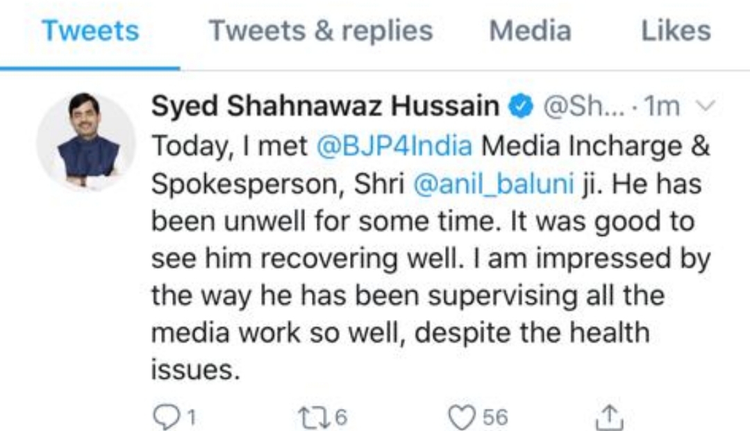 बता दे कि केंद्रीय मंत्री रविशंकर प्रसाद और राष्ट्रीय प्रवक्ता सैयद शाहनवाज हुसैन ने ट्वीट द्वारा भी पहाड़ पुत्रब बलूनी जी के स्वास्थ्य की कामना की है