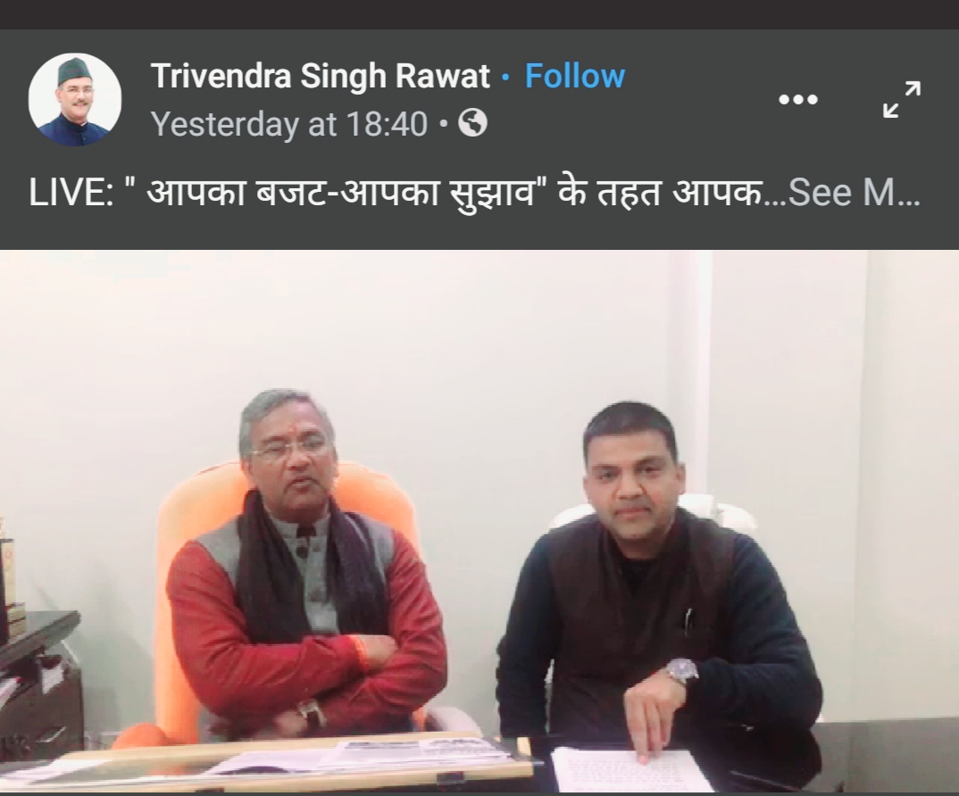 शनिवार को आम जनता से फेसबुक पर लाइव संवाद किया। उन्होंने उनके फेसबुक पेज और बजट विभाग के फेसबुक पेज पर उत्तराखंड के 2020-21 बजट के लिए लोगों के द्वारा दिये सुझावों को सराहनीय बताया। मुख्यमंत्री त्रिवेन्द्र ने कहा कि जागरुक नागरिक होने के नाते बहुत से लोगों ने इसमें बढ़ चढ़कर हिस्सा लिया और अपने सुझाव दिए लगभग 1500 सुझाव इसमें मिले जिनमें से ज्यादातर सुझाव किसानों की बेहतरी, पहाड़ों से पलायन रोकने के उपाय, स्वास्थ्य सुविधाओं और रोजगार सृजन से संबंधित हैं। मुख्यमंत्री ने कहा कि उनकी कोशिश होगी कि सभी सुझावों का अध्ययन कर ज्यादा से ज्यादा सुझावों को बजट में शामिल किया जाए।