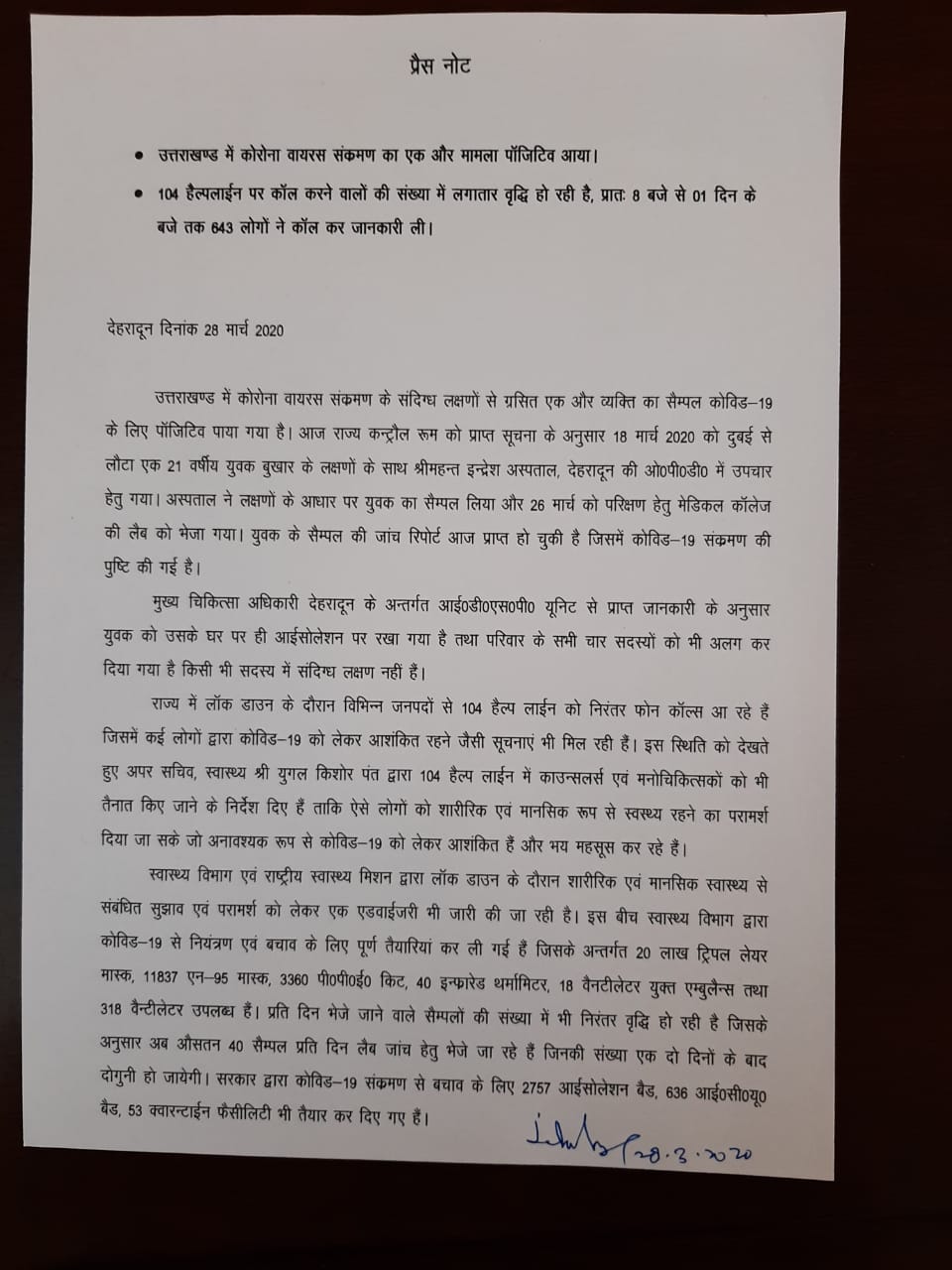 उत्तराखंड में एक और कोरोना वायरस का पॉजिटिव मामला आया सामने।