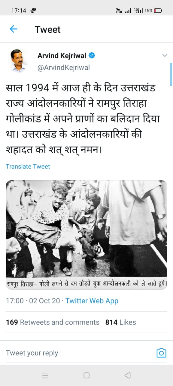 19 94 को आज ही के दिन निहत्थे दिल्ली जा रहे आंदोलनकारियों को यूपी पुलिस ने अपना शिकार बनाया था जिसमें 7 आंदोलनकारी शहीद हो गए थे कई आंदोलनकारी इस घटना में घायल हुए आप पार्टी के राष्ट्रीय संयोजक ने भी उत्तराखंड आंदोलन में शहीद हुए आंदोलनकारियों को नमन किया केजरीवाल ने अपने ट्वीट के जरिए आंदोलन के दौरान हुए शहीदों को श्रद्धा सुमन अर्पित किए।