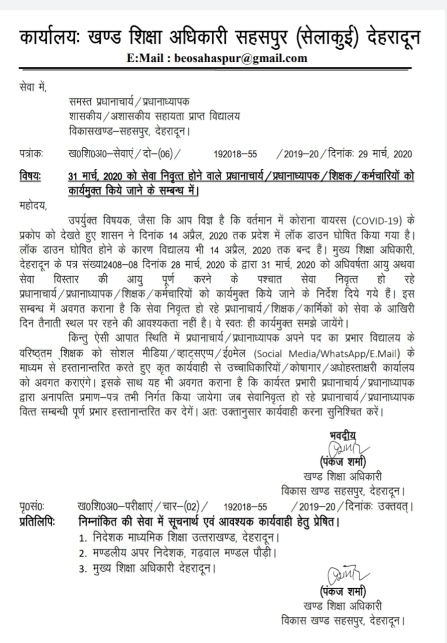 शिकायतें लगातार आ रही है पूछता है बोलता उत्तराखंड आखिर राजधानी देहरादून के आशाकीय स्कूल महेश्वरानंद इंटर कॉलेज माजरा और अमरावती दून वैली पब्लिक स्कूल पंडितवाड़ी एक शिक्षक की रिलीविंग और जॉइनिंग के लिए लॉक डाउन के बावजूद कैसे खोल दिया गया?? जिसकी परमिशन मुख्य शिक्षा अधिकारी से लेना भी उचित नहीं समझा गया , ऐसे में सवाल यह उठ रहा है कि आखिर दोनों स्कूलों को ऐसी क्या आन पड़ी थी जब देशभर में लॉक डाउन चल रहा ????