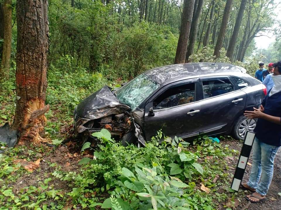 थानो-जौलीग्रांट सड़क मार्ग पर जंगल के बीच पेड़ से टकराकर कार के उड़े परखच्चे।