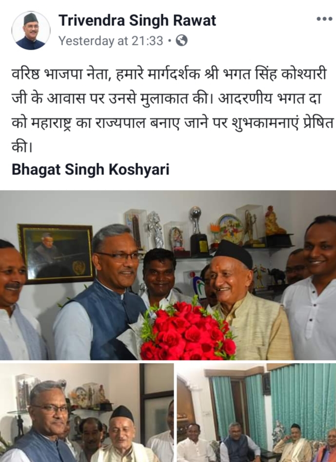 ओर फिर एक गरीब परिवार से निकलकर विधान परिषद सदस्य, विधायक, मुख्यमंत्री, राज्यसभा सदस्य, लोकसभा सांसद और अब राज्यपाल की कुर्सी तक पहुंचे 75 वर्षीय भगत सिंह कोश्यारी जी की सादगी का हर कोई कायल है