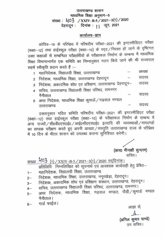 यह समिति परिषदीय परीक्षा 2021 की इंटरमीडिएट परीक्षा तथा हाईस्कूल परीक्षा के परीक्षा फल निर्माण के संबंध में अन्य राज्यो, सीबीएसई, आईसीएसई इत्यादि की व्यवस्थाओं मापदंडों का समय परीक्षण करते हुए अपनी आख्या और संस्तुति उत्तराखंड राज्य के परिपेक्ष में 10 दिनों के भीतर शासन को उपलब्ध कराएंगे।