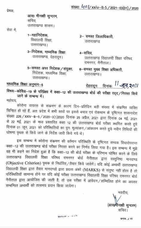 इस सम्बन्ध में कोरोना संक्रमण की वर्तमान परिस्थिति के दृष्टिगत सम्यक विचारोपरान्त कक्षा 12 की उत्तराखण्ड बोर्ड परीक्षा निरस्त करने का निर्णय लिया गया है। इस सम्बन्ध में मुझे यह भी कहने का निदेश हुआ है कि कक्षा 12 की बोर्ड परीक्षा के परिणाम घोषित करने के लिये उत्तराखण्ड विद्यालयी शिक्षा परिषद रामनगर बोर्ड नैनीताल द्वारा वस्तुनिष्ठ मानदण्ड (Objective Criterion) पृथक से निर्धारित / तैयार किये जायेगें। यदि कोई अभ्यर्थी उत्तराखण्ड विद्यालयी शिक्षा द्वारा तैयार मानदण्डों द्वारा प्रदत्त अंको (MARKS) से संतुष्ट नहीं होता है तो परिस्थितियाँ सामान्य होने पर यदि कोई परीक्षा उत्तराखण्ड विद्यालयी शिक्षा परिषद रामनगर बोर्ड नैनीताल द्वारा आयोजित की जाती है, तो उस परीक्षा में आवेदन / सम्मिलित होने का अवसर सम्बन्धित अभ्यर्थी को तत्समय प्रदान किया जायेगा।