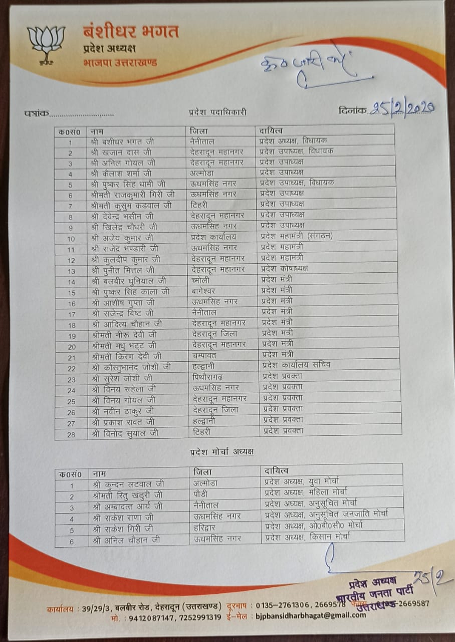 उत्तराखंडः भाजपा प्रदेश अध्यक्ष बंशीधर भगत ने की अपनी टीम घोषित, कार्यसमिति मै है इन सभी के नाम शामिल।