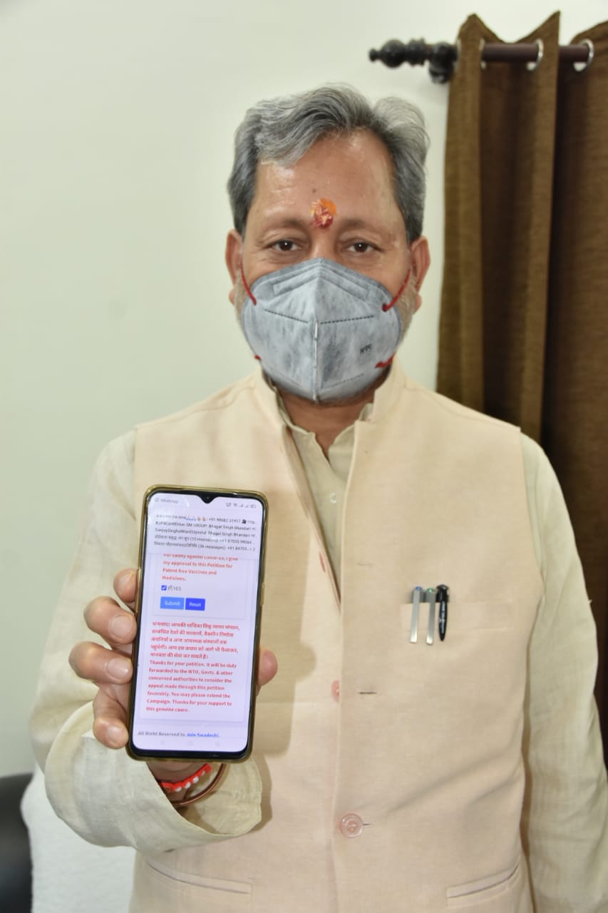 मुख्यमंत्री तीरथ सिंह रावत ने स्वदेशी जागरण मंच द्वारा कोरोना की वैक्सीन को पेटेंट मुक्त कराने के लिए चलाए जा रहे वैश्विक सर्व सुलभ टीकाकरण एवं चिकित्सा अभियान के अंतर्गत 20 जून को विश्व जागृति दिवस के दिन पेटेन्ट फ्री करने के लिए डिजिटल हस्ताक्षर कर समर्थन दिया।