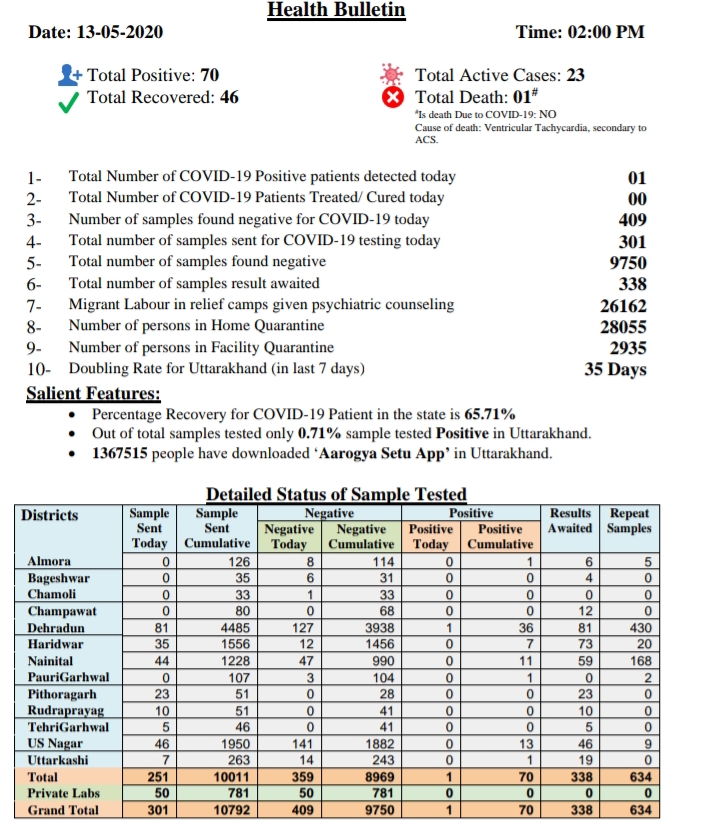 उत्तराखंड : कोरोना पॉजिटिव मरीजों की संख्या बढ़कर 70 , देहरादून में 52 साल की महिला का सैंपल आया पॉजिटिव ।