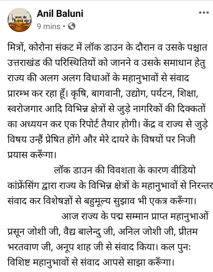 पहाड़ पुत्र के नाम से उत्तराखंड मैं लोकप्रिय सांसद बलूनी ने कहा कि लॉकडाउन के कारण वीडियो कॉन्फ्रेंसिंग द्वारा ही संवाद संभव था, इसलिए उन्होंने यह क्रम प्रारंभ किया है। वह भविष्य में कृषि, बागवानी, उद्योग, शिक्षा, पर्यटन, सेवा एवं स्वरोजगार आदि क्षेत्रों के विशेषज्ञ से चर्चा करेंगे। सांसद ने कहा कि वह इन सभी संवादों के आधार पर एक विस्तृत रिपोर्ट तैयार करेंगे।