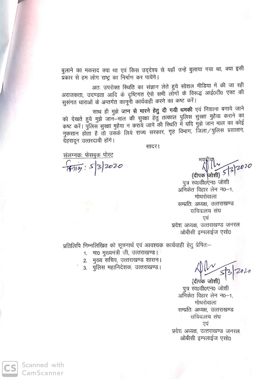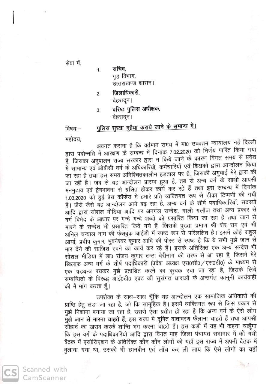 उत्तराखंड जनरल ओबीसी इंप्लाइज एसोसिएशन के प्रदेश अध्यक्ष दीपक जोशी ने आज सचिव गृह उत्तराखंड शासन जिलाधिकारी देहरादून और वरिष्ठ पुलिस अधीक्षक देहरादून को पत्र लिखकर पुलिस सुरक्षा मुहैया कराने की मांग की है ।