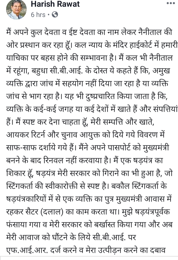 मैं अपने कुल देवता व ईष्ट देवता का नाम लेकर नैनीताल की ओर प्रस्थान कर रहा हॅॅू। कल न्याय के मंदिर हाईकोर्ट में हमारी याचिका पर बहस होने की सम्भावना है। मैं कल भी नैनीताल में रहूंगा, बहुधा सी.बी.आई. के दोस्त ये कहते हैं कि, अमुख व्यक्ति द्वारा जांच में सहयोग नहीं दिया जा रहा है या व्यक्ति जांच से भाग रहा है। यह भी दुष्प्रचारित किया जाता है कि, व्यक्ति के कई-कई जगह या कई देशों में खाते हैं और संपत्तियां हैं। मैं स्पष्ट कर देना चाहता हॅू, मेरी सम्पत्ति और खाते, आयकर रिटर्न और चुनाव आयुक्त को दिये गये विवरण में साफ-साफ दर्शाये गये हैं। मैंने अपने पासपोर्ट को मुख्यमंत्री बनने के बाद रिनवल नहीं करवाया है। मैं एक षड़यंत्र का शिकार हॅू, षड़यंत्र मेरी सरकार को गिराने का भी हुआ है, जो स्टिंगकर्ता की स्वीकारोक्ती से स्पष्ट है। बकौल स्टिंगकर्ता के षड़यंत्रकारियों में से एक व्यक्ति का पुत्र मुख्यमंत्री आवास में रहकर सैटर (दलाल) का काम करता था। मुझे षड़यंत्रपूर्वक फंसाया गया व मेरी सरकार को बर्खास्त किया गया और अब मेरी आवाज को घौंटने के लिये सी.बी.आई. पर एफ.आई.आर. दर्ज करने व मेरा उत्पीड़न करने का दबाव बनाया जा रहा है। दिन के उजाले की तरह, यह स्पष्ट है कि, मैं रूपया देकर किसी विधायक की खरीद-फरोख्त नहीं कर रहा हॅू। जबकि, हमारे राज्य में ऐसे कुछ स्टिंग सार्वजनिक हैं, जिनमें सत्ता के निकटस्त लोग सरकारी काम करवाने के ऐवज में, भारी मात्रा में घूस स्वरूप रूपया मांग रहे हैं या ले रहे हैं। मुझे न्यायालय के समान ही, जनता-जनार्दन के न्याय पर भी विश्वास है। मैंने निष्ठापूर्वक अपने जीवन और स्वास्थ्य की कीमत पर भी उत्तराखण्ड की सेवा की है। गरीब व जरूरतमंद का दुःख बांटा है। कमजोर के साथ, मैं और मेरी सरकार खड़ी रही है। यदि आपको लगता है कि, मुझे षड़यंत्र का शिकार बनाया गया है, तो मेरे लिये यह प्रार्थना करें कि, मैं भारत की न्याय व्यवस्था से न्याय प्राप्त करने में सफल होऊं। मेरे पास न्यायलय का खर्चा उठाने की क्षमता नहीं है, मैं अपने दोस्तों के सहारे ही न्यायलय के सम्मुख खड़ा हॅूॅ। मेरी शक्ति आपके भावना के आर्शीवाद में है। भगवान केदार से मेरी प्रार्थना है कि, इस प्रकरण की तह में जाने में माननीय न्यायालय की मद्द करें। मुझे भरोसा है, इस प्रसंग के निर्णय के बाद स्टिंग संस्कृति और स्टिंगबाजी के सहारे पे राजनीति करने वाले चेहरे बेपर्दा हो जायेंगे और उनको न्यायालय के सम्मुख, अपराधी के तौर पर खड़ा होना पड़ेगा।