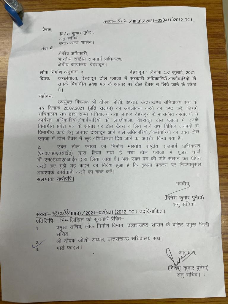 अनु सचिव दिनेश कुमार पुणे ठाणे को लिखा पत्र लच्छीवाला, देहरादून टोल प्लाजा में सरकारी अधिकारियों / कर्मचारियों से उनके विभागीय प्रवेश पत्र के आधार पर टोल टैक्स न लिये जाने के संबंध मे आग्रह किया गया है आपको बता दे कि दीपक जोशी, अध्यक्ष, उत्तराखण्ड सचिवालय संघ के पत्र दिनांक 20.07 2021 (प्रति संलग्न) का अवलोकन करने का कष्ट करें, जिसमें सचिवालय संघ द्वारा राज्य सचिवालय तथा जनपद देहरादून के शासकीय कार्यालयों में कार्यरत अधिकारियों / कर्मचारियों को लच्छीवाला, देहरादून टोल प्लाजा में उनके विभागीय प्रवेश पत्र के आधार पर टोल टैक्स न लिये जाने तथा विभिन्न जनपदों से विभागीय कार्य हेतु जनपद देहरादून आने वाले अधिकारियों / कर्मचारियों को उक्त टोल प्लाजा में टोल टैक्स में छूट / शिथिलता दिये जाने का अनुरोध किया गया है।