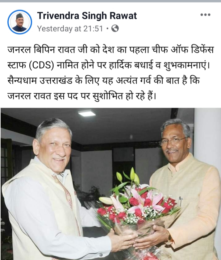 उत्तराखंड के मुख्यमंत्री त्रिवेन्द्र सिंह रावत ने थलसेना अध्यक्ष एवं चीफ ऑफ स्टॉफ कमेटी (सीओएससी) के अध्यक्ष जनरल बिपिन रावत को देश का पहला चीफ ऑफ डिफेंस (सी.डी.एस) नियुक्त किये जाने पर बधाई दी है। उत्तराखंड के मुख्यमंत्री त्रिवेंद्र जी ने कहा कि जनरल रावत को सी.डी.एस का दायित्व सौंपा जाना उत्तराखण्ड का भी सम्मान है। उन्होंने कहा कि हमें अपनी सैन्य परंपरा पर गर्व है। जनरल रावत के सी.डी.एस बनने से हमारी यह गौरवमय परंपरा भी सम्मानित हुई है। वही मुख्यमंत्री ने कहा कि देश की सुरक्षा की दृष्टि से प्रधानमंत्री मोदी ने 15 अगस्त को लाल किले की प्राचीर से राष्ट्रहित से जुड़े इस अति महत्वपूर्ण पद की घोषणा की थी। उन्होंने कहा कि सी.डी.एस से तीनों सेनाओं के मध्य बेहतर समन्वय स्थापित होगा तथा देश की सुरक्षा व्यवस्था भी और अधिक मजबूत होगी।