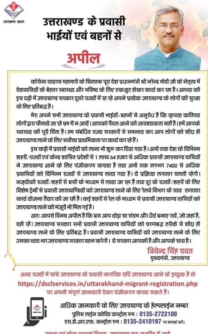 जी हा देश के अन्य राज्यों में फंसे हुए उत्तराखंड के डेढ़ लाख से अधिक प्रवासियों( भाई बहनों) की वापसी के लिए त्रिवेंद्र सरकार ने कल एक ओर बड़ा कदम उठाते हुए नई एसओपी जारी कर दी है