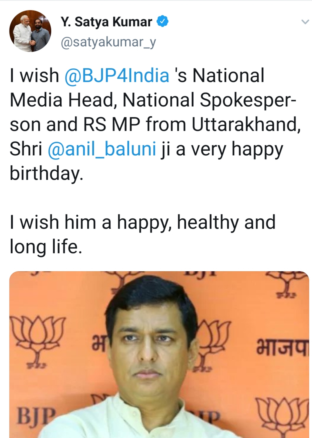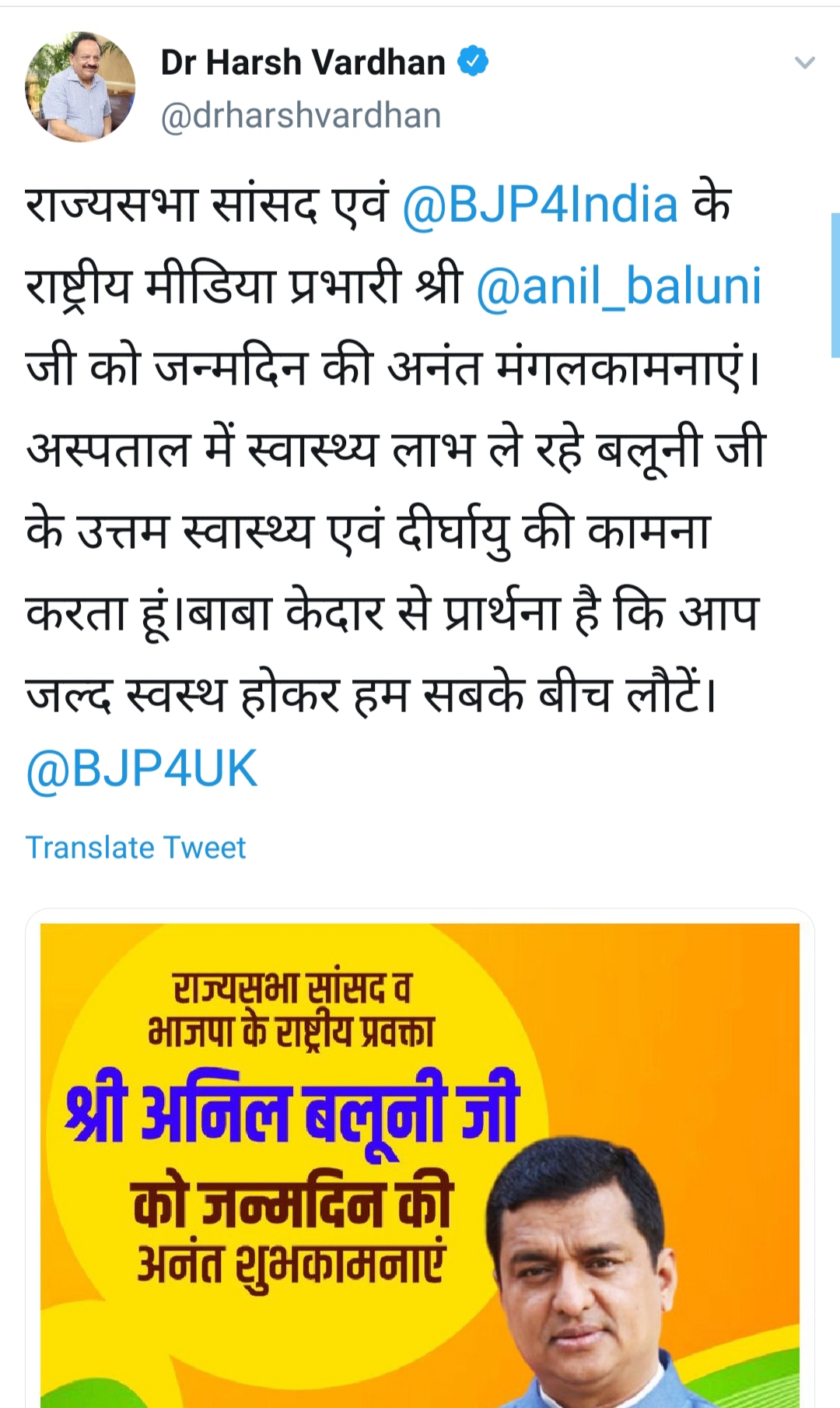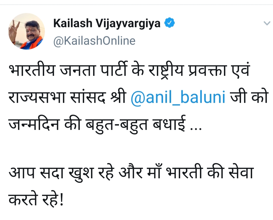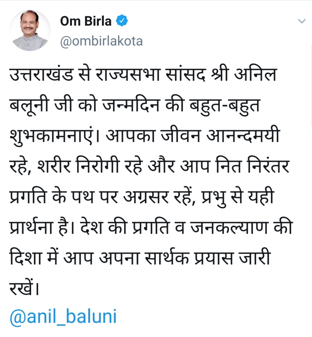 भारतीय जनता पार्टी के राष्ट्रीय अध्यक्ष एवं केंद्रीय गृहमंत्री अमित शाह जी , भारतीय जनता पार्टी के कार्यकारी अध्यक्ष श्री जे पी नड्डा जी , लोकसभा अध्यक्ष श्री ओम बिरला, उत्तराखंड के मुख्यमंत्री त्रिवेंद्र सिंह रावत, त्रिपुरा के मुख्यमंत्री विप्लव कुमार देव, केंद्रीय मंत्री स्मृति ईरानी, केंद्रीय स्वास्थ्य मंत्री हर्षवर्धन, राज्यसभा सांसद प्रोफेसर राकेश सिन्हा, भाजपा के राष्ट्रीय महासचिव कैलाश विजयवर्गीय ,भारतीय जनता पार्टी के राष्ट्रीय उपाध्यक्ष एवं उड़ीसा के वरिष्ठ भाजपा नेता जय पांडा सहित अनेक सांसदों, मीडिया जगत की हस्तियों ने ट्विटर के द्वारा पहाड़ पुत्र बलूनी को जन्मदिन की शुभकामनाएं दी। तो वही उत्तराखंड मैं भाजपा कार्यकर्ताओं ने स्वर्गाश्रम ऋषिकेश और कोटद्वार में पूजा अर्चना कर उनकी लंबी आयु की कामना की।