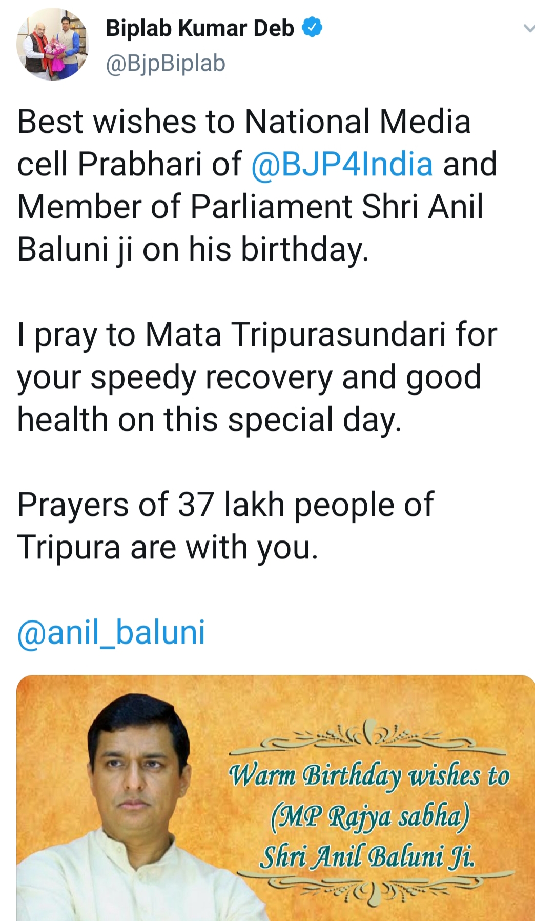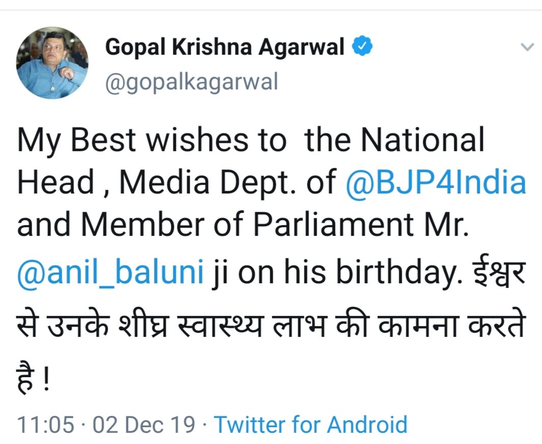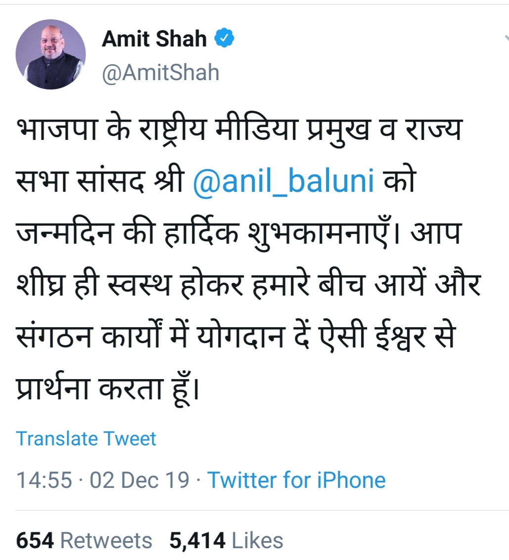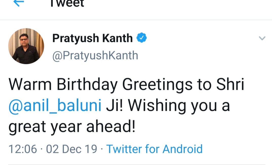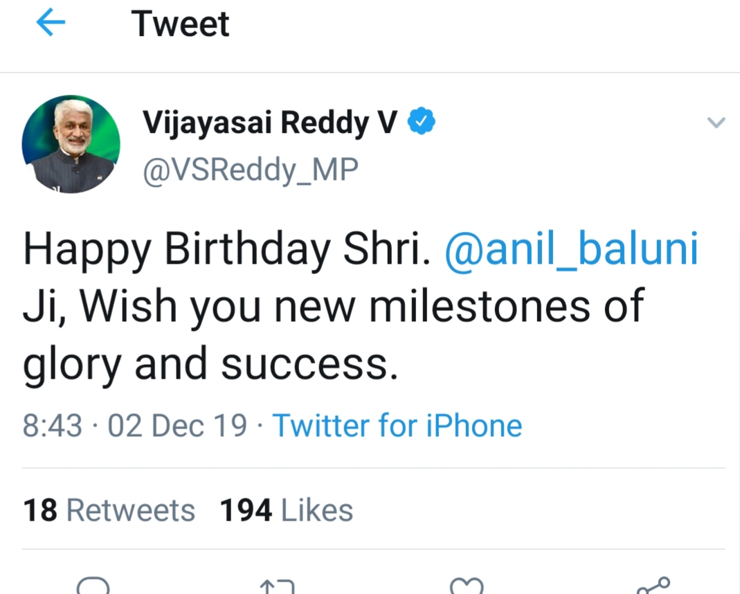 भारतीय जनता पार्टी के राष्ट्रीय अध्यक्ष एवं केंद्रीय गृहमंत्री अमित शाह जी , भारतीय जनता पार्टी के कार्यकारी अध्यक्ष श्री जे पी नड्डा जी , लोकसभा अध्यक्ष श्री ओम बिरला, उत्तराखंड के मुख्यमंत्री त्रिवेंद्र सिंह रावत, त्रिपुरा के मुख्यमंत्री विप्लव कुमार देव, केंद्रीय मंत्री स्मृति ईरानी, केंद्रीय स्वास्थ्य मंत्री हर्षवर्धन, राज्यसभा सांसद प्रोफेसर राकेश सिन्हा, भाजपा के राष्ट्रीय महासचिव कैलाश विजयवर्गीय ,भारतीय जनता पार्टी के राष्ट्रीय उपाध्यक्ष एवं उड़ीसा के वरिष्ठ भाजपा नेता जय पांडा सहित अनेक सांसदों, मीडिया जगत की हस्तियों ने ट्विटर के द्वारा पहाड़ पुत्र बलूनी को जन्मदिन की शुभकामनाएं दी। तो वही उत्तराखंड मैं भाजपा कार्यकर्ताओं ने स्वर्गाश्रम ऋषिकेश और कोटद्वार में पूजा अर्चना कर उनकी लंबी आयु की कामना की।