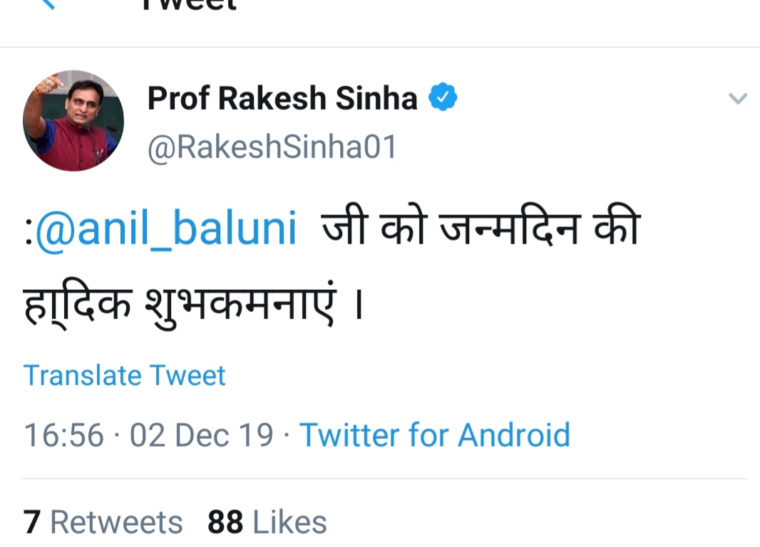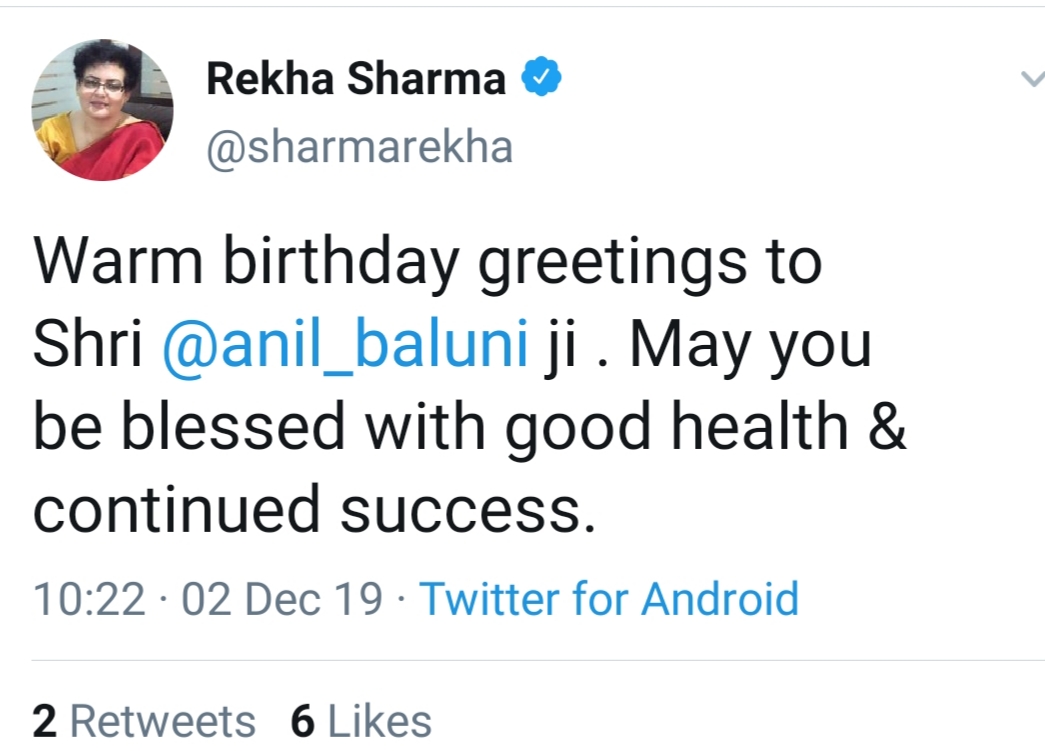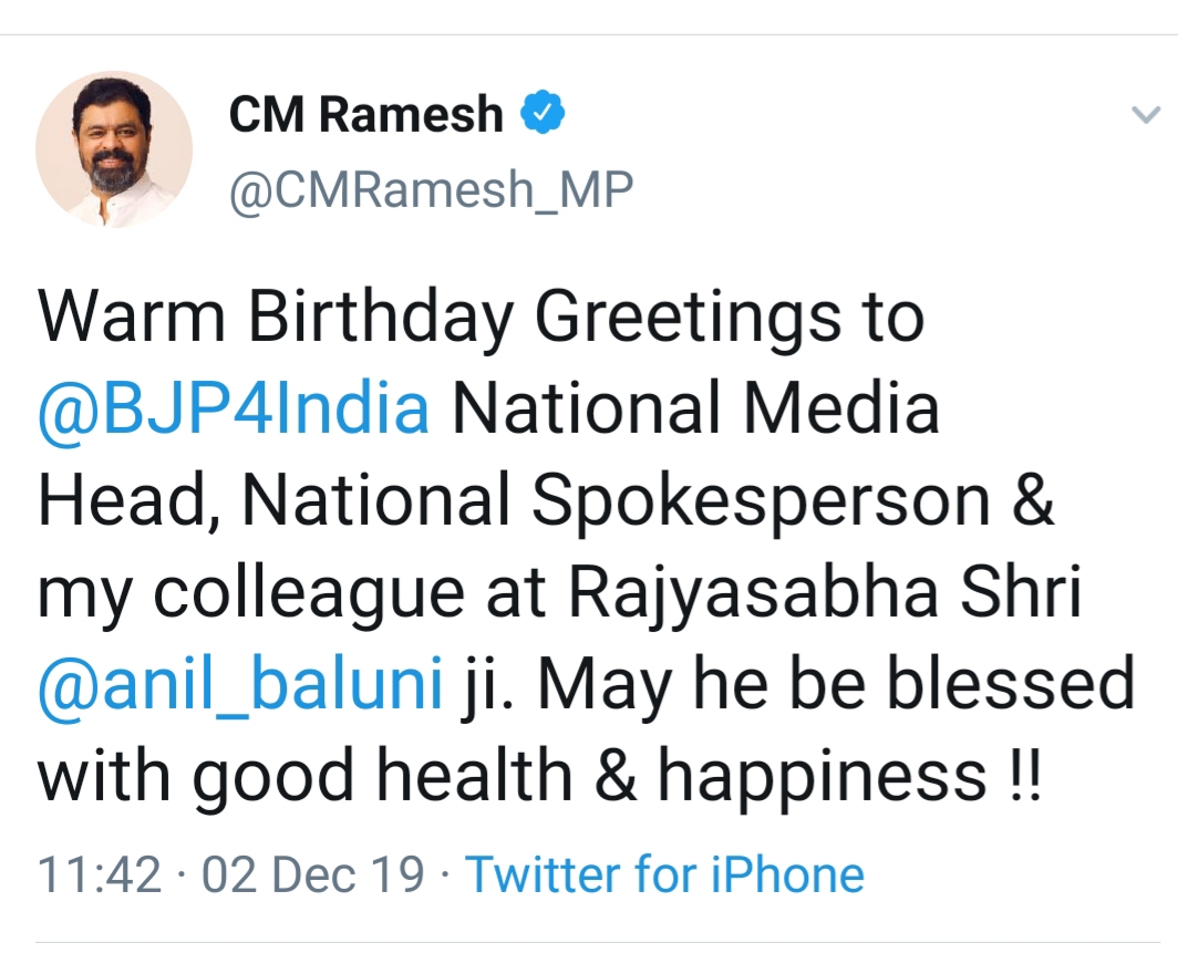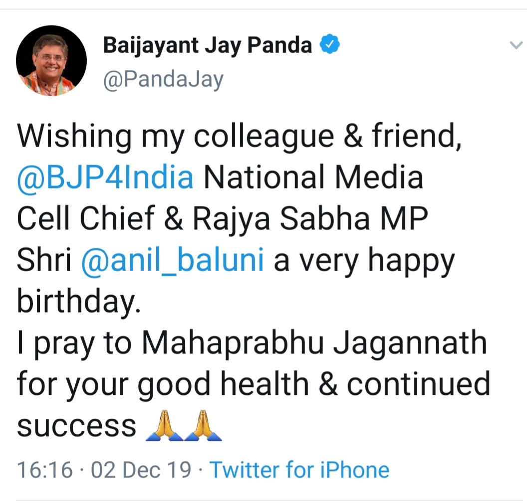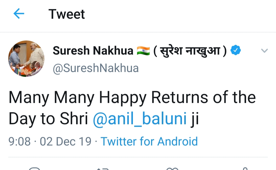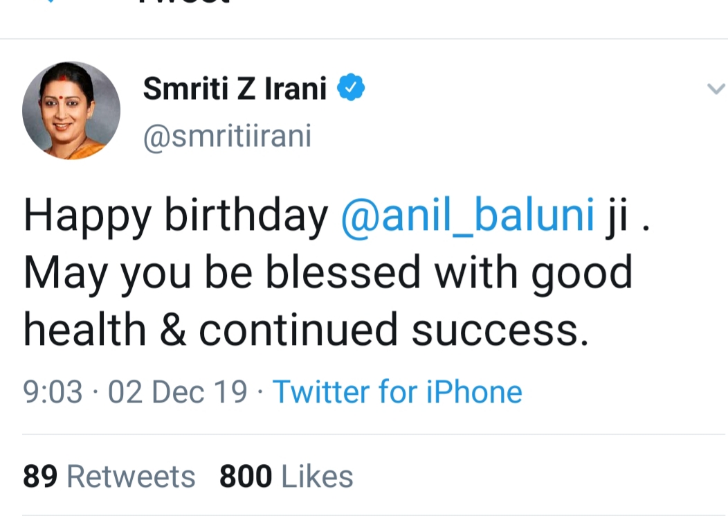 भारतीय जनता पार्टी के राष्ट्रीय अध्यक्ष एवं केंद्रीय गृहमंत्री अमित शाह जी , भारतीय जनता पार्टी के कार्यकारी अध्यक्ष श्री जे पी नड्डा जी , लोकसभा अध्यक्ष श्री ओम बिरला, उत्तराखंड के मुख्यमंत्री त्रिवेंद्र सिंह रावत, त्रिपुरा के मुख्यमंत्री विप्लव कुमार देव, केंद्रीय मंत्री स्मृति ईरानी, केंद्रीय स्वास्थ्य मंत्री हर्षवर्धन, राज्यसभा सांसद प्रोफेसर राकेश सिन्हा, भाजपा के राष्ट्रीय महासचिव कैलाश विजयवर्गीय ,भारतीय जनता पार्टी के राष्ट्रीय उपाध्यक्ष एवं उड़ीसा के वरिष्ठ भाजपा नेता जय पांडा सहित अनेक सांसदों, मीडिया जगत की हस्तियों ने ट्विटर के द्वारा पहाड़ पुत्र बलूनी को जन्मदिन की शुभकामनाएं दी। तो वही उत्तराखंड मैं भाजपा कार्यकर्ताओं ने स्वर्गाश्रम ऋषिकेश और कोटद्वार में पूजा अर्चना कर उनकी लंबी आयु की कामना की।