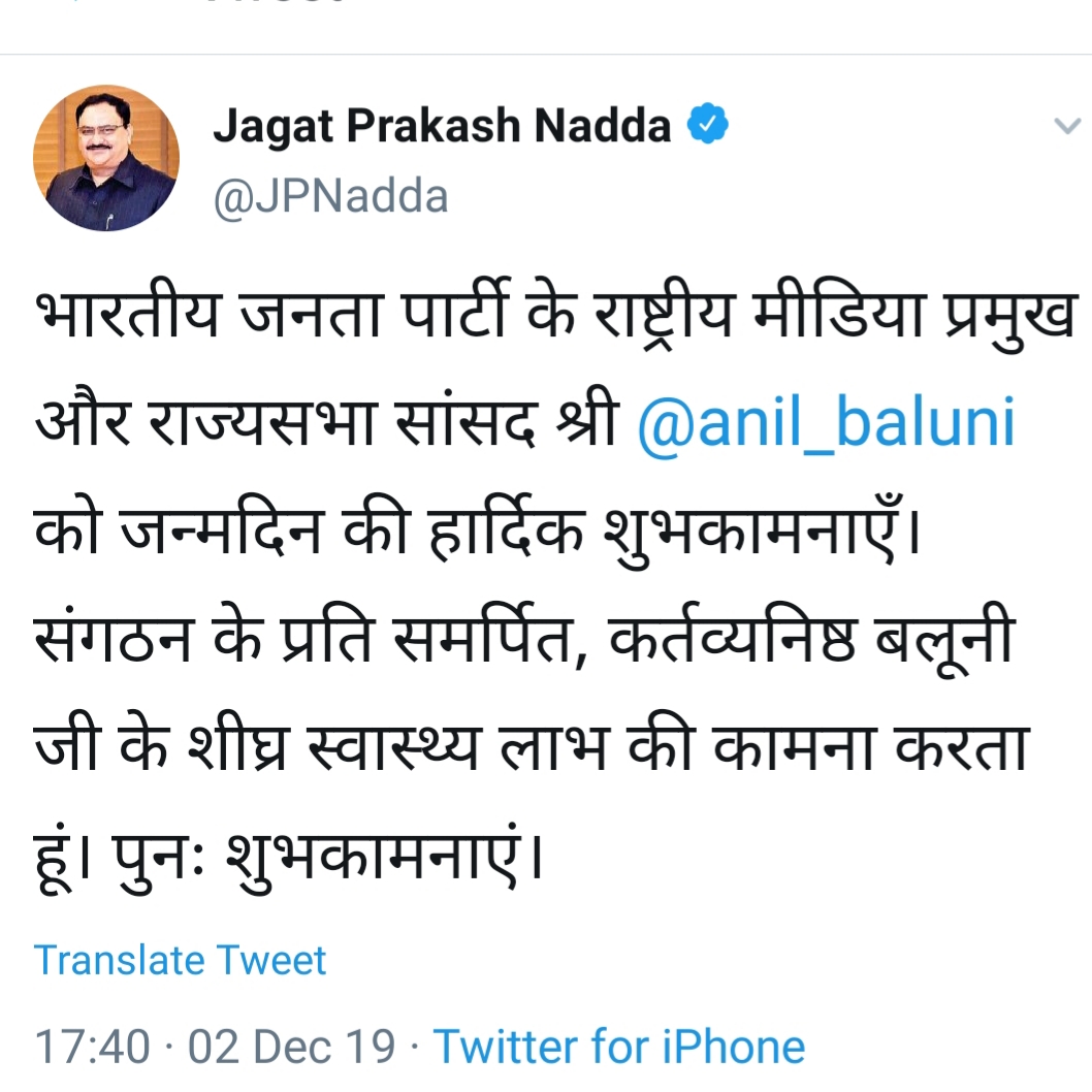 भारतीय जनता पार्टी के राष्ट्रीय मीडिया प्रमुख और उत्तराखंड से राज्यसभा सदस्य पहाड़ पुत्र अनिल बलूनी जी को उनके जन्मदिन के अवसर पर अनेक गणमान्य व्यक्तियों द्वारा उन्हें शुभकामनाएं प्रेषित की गई ।