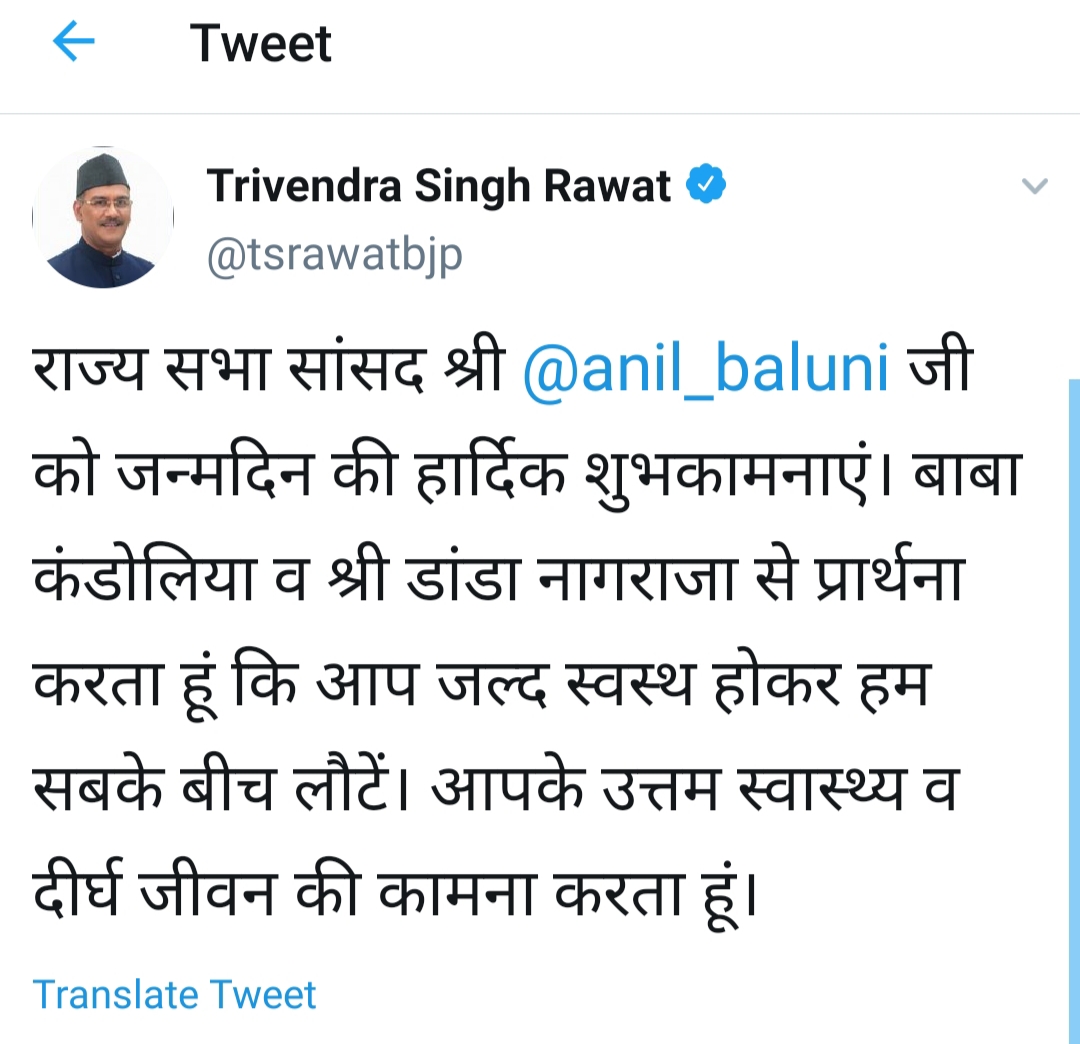 बोलता उत्तराखंड की तरफ से हमारे पूरे परिवार की तरफ से पहाड़ पुत्र अनिल बलूनी जी को बहुत बहुत सुभकामनाये । आप बाबा केदारनाथ जी के आशिष से उत्तराखंड के सभी देवी देवताओं के आशीष से , कुल देवी देवताओं के आशीष से जल्द स्वस्थ होंगे ये हमारा विस्वास है।