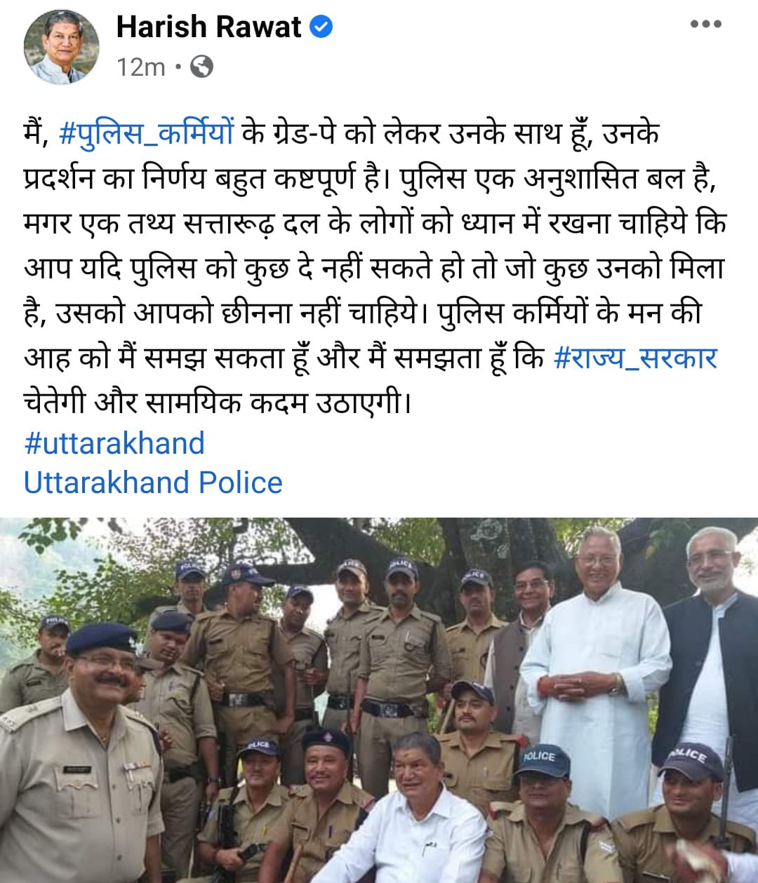 मैं, पुलिस कर्मियों के ग्रेड-पे को लेकर उनके साथ हूंँ, उनके प्रदर्शन का निर्णय बहुत कष्टपूर्ण है। पुलिस एक अनुशासित बल है, मगर एक तथ्य सत्तारूढ़ दल के लोगों को ध्यान में रखना चाहिये कि आप यदि पुलिस को कुछ दे नहीं सकते हो तो जो कुछ उनको मिला है, उसको आपको छीनना नहीं चाहिये। पुलिस कर्मियों के मन की आह को मैं समझ सकता हूंँ और मैं समझता हूंँ कि राज्य_सरकार चेतेगी और सामयिक कदम उठाएगी।
