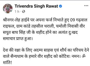 श्रीनगर-लेह हाईवे पर अपना फर्ज निभाते हुए 09 गढ़वाल राइफल, ग्राम कांडे तहसील थराली, चमोली निवासी वीर सपूत बाघ सिंह जी के शहीद होने का अत्यंत दुःखद समाचार प्राप्त हुआ।