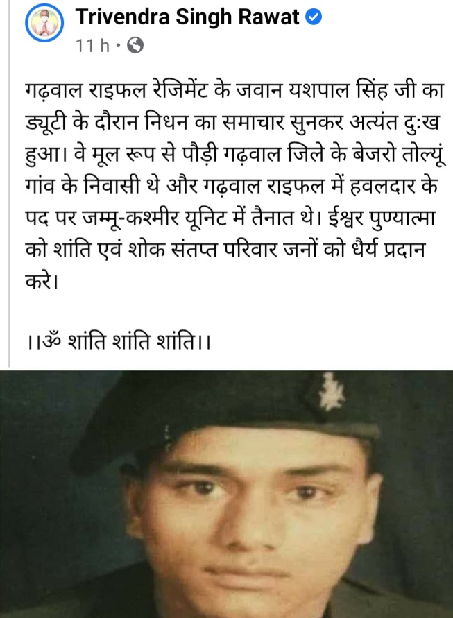 गढ़वाल राइफल रेजिमेंट के जवान यशपाल सिंह जी का ड्यूटी के दौरान निधन का समाचार सुनकर अत्यंत दुःख हुआ। वे मूल रूप से पौड़ी गढ़वाल जिले के बेजरो तोल्यूं गांव के निवासी थे और गढ़वाल राइफल में हवलदार के पद पर जम्मू-कश्मीर यूनिट में तैनात थे। ईश्वर पुण्यात्मा को शांति एवं शोक संतप्त परिवार जनों को धैर्य प्रदान करे।