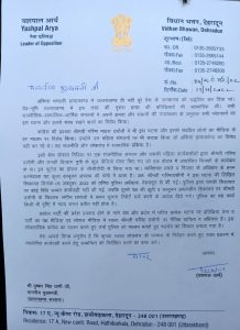 नेता प्रतिपक्ष द्वारा मुख्यमंत्री पुष्कर सिंह धामी को लिखे पत्र की प्रति संलग्न है