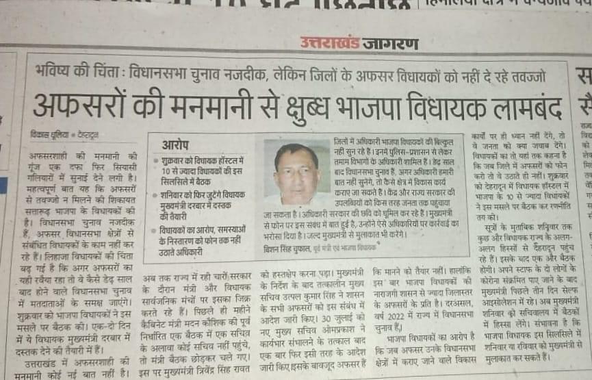 वही भाजपा के सबसे अनुभवी नेता बिशन सिंह चुफाल सबसे अधिक नाराज बताये जा रहे है।अफसरों की मनमानी पर! या बात कुछ और है ये तो जल्द होने वाली प्रेस कांफ्रेंस मैं मालूम चलेंगा