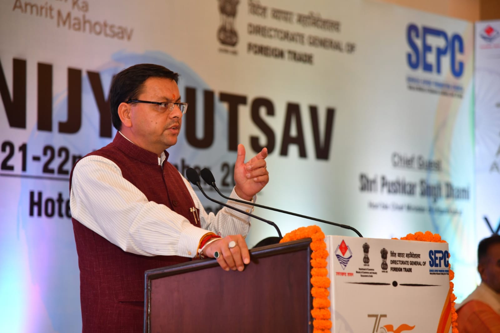 मुख्यमंत्री पुष्कर सिंह धामी ने कहा कि पिछले पांच सालों में ही उत्तराखंड ने निर्यात के मामले में करीब दोगुना से अधिक की बढ़त हासिल की है। वर्ष 2017-18 में उत्तराखंड से 10,836 करोड़ रुपये का निर्यात हुआ, वहीं 2020-21 में यह बढ़कर 15,914 करोड़ रुपये पहुंच गया है। राज्य में आटोमोबाइल व फार्मा इकाइयां सबसे बड़े निर्यातक क्षेत्र के रूप में उभरे हैं। इसके अलावा उत्तराखंड से पुष्प उत्पादन, कृषि एवं खाद्य प्रसंस्करण, जैविक उत्पाद, सगंध-औषधीय पौधे, जैव प्रौद्योगिकी, हस्तशिल्प की वस्तुओं का निर्यात विदेशों में होता है। राज्य में निर्यात क्षमता और राज्य से निर्यात योग्य उत्पादों एवं सेवाओं को बढ़ावा देने और प्रदर्शित करने के लिए भारत को एक उभरती हुई आर्थिक शक्ति के रूप में प्रतिस्थापित करने के लिए वाणिज्य उत्सव का आयोजन मील का पत्थर साबित होगा।