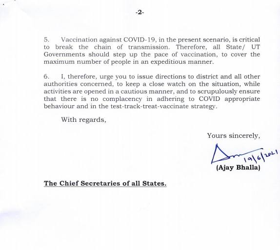 केंद्रीय गृह सचिव अजय भल्ला ने सभी राज्यों के मुख्य सचिवों को पत्र लिखा है यह सुनिश्चित करने के लिए कि सभी राज्यों में COVID उपयुक्त व्यवहार और परीक्षण-ट्रैक-उपचार-टीकाकरण रणनीति का पालन करने में कोई ढिलाई नहीं की जाए।