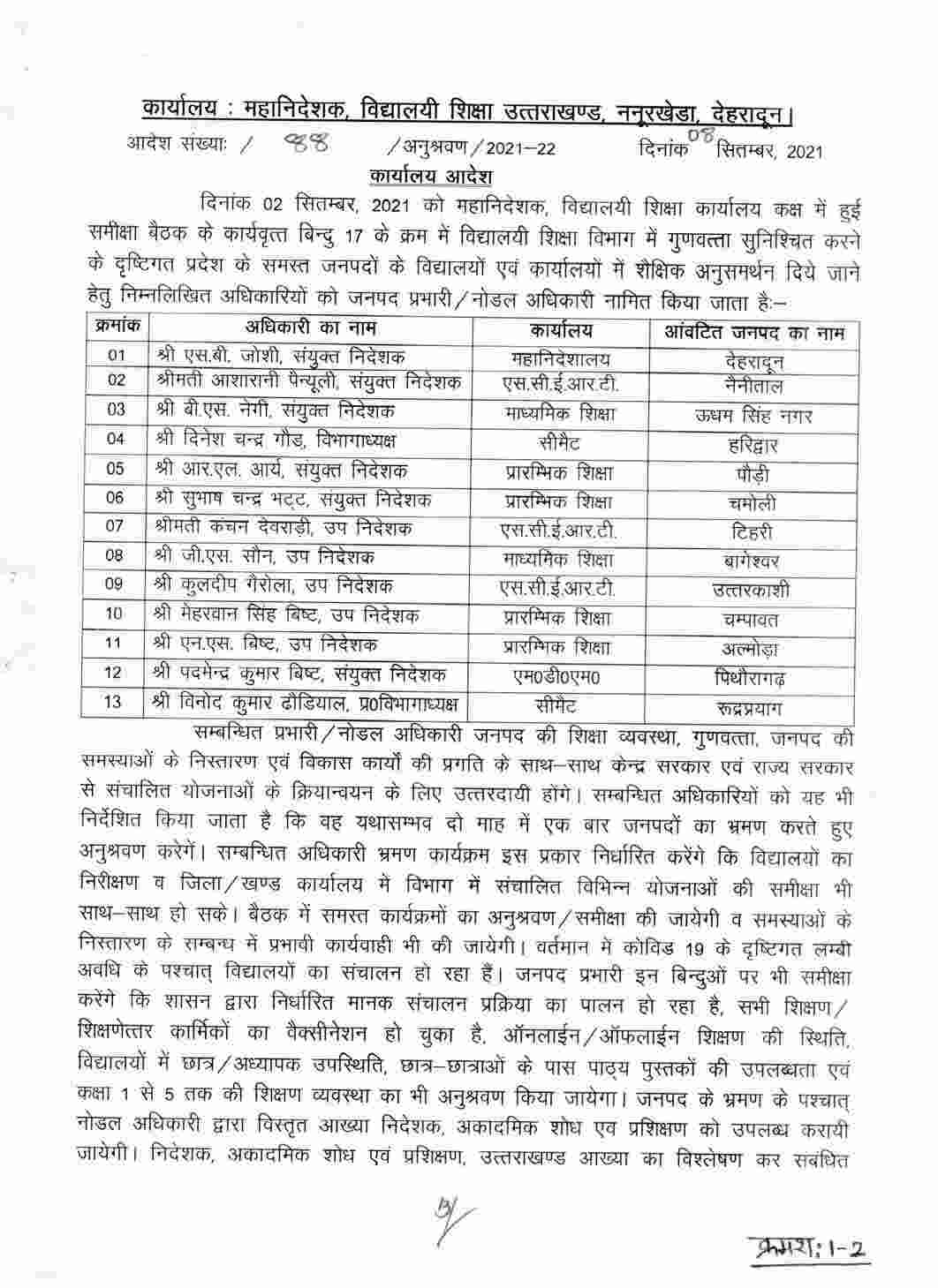 विद्यालयी शिक्षा विभाग में गुणवत्ता सुनिश्चित करने के दृष्टिगत प्रदेश के समस्त जनपदों के विद्यालयों एवं कार्यालयों में शैक्षिक अनुसमर्थन दिये जाने हेतु निम्नलिखित अधिकारियों को जनपद प्रभारी / नोडल अधिकारी नामित किए गए है