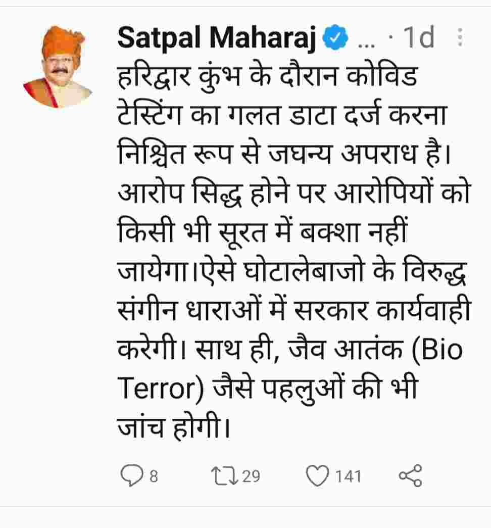 पर्यटन मंत्री सतपाल महाराज ने कहा है कि हाल ही में संपन्न हरिद्वार कुंभ के दौरान जैविक आतंक फैलाने की आशंका से इनकार नहीं किया जा सकता। सरकार इस पहलू पर गंभीर है। कोरोना जांच घोटाले के साथ इसकी भी जांच करवाई जाएगी। शुक्रवार को महाराज ने इस बाबत टवीट भी किया और अपने सोशल मीडिया मीडिया पेज पर भी जैविक आतंक पर चिंता जाहिर की।