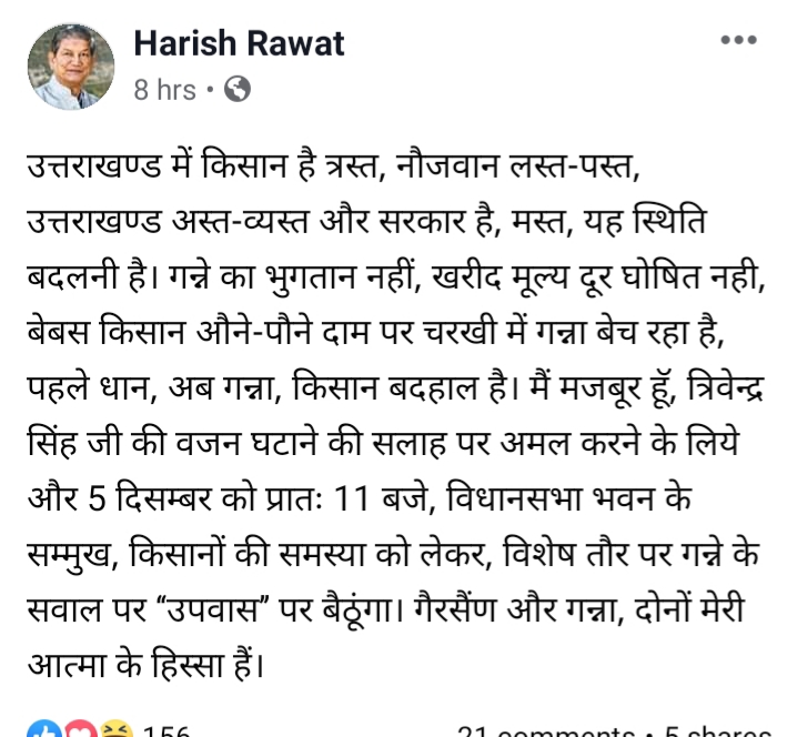 उत्तराखण्ड में किसान है त्रस्त, नौजवान लस्त-पस्त, उत्तराखण्ड अस्त-व्यस्त और सरकार है, मस्त, यह स्थिति बदलनी है। गन्ने का भुगतान नहीं, खरीद मूल्य दूर घोषित नही, बेबस किसान औने-पौने दाम पर चरखी में गन्ना बेच रहा है, पहले धान, अब गन्ना, किसान बदहाल है। मैं मजबूर हूॅ, त्रिवेन्द्र सिंह जी की वजन घटाने की सलाह पर अमल करने के लिये और 5 दिसम्बर को प्रातः 11 बजे, विधानसभा भवन के सम्मुख, किसानों की समस्या को लेकर, विशेष तौर पर गन्ने के सवाल पर ‘‘उपवास’’ पर बैठूंगा। गैरसैंण और गन्ना, दोनों मेरी आत्मा के हिस्सा हैं।