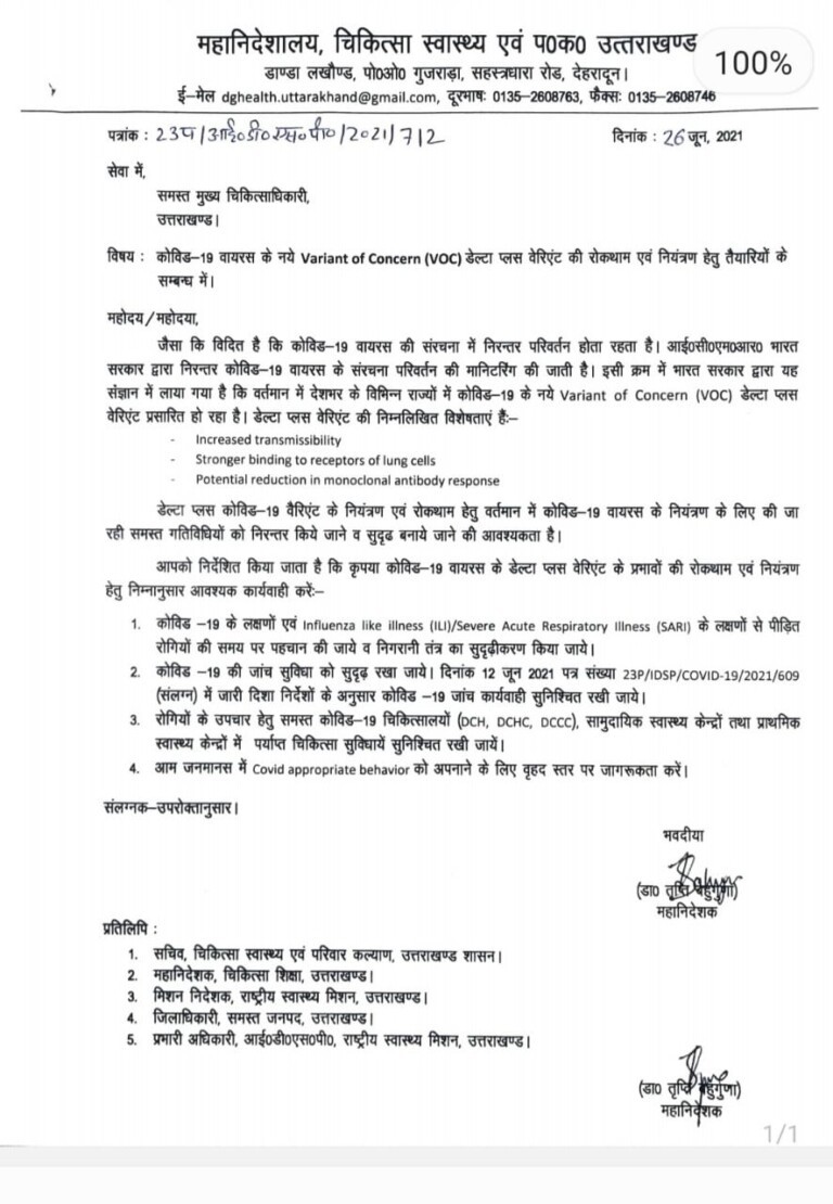 आदेश जारी करते हुए स्वास्थ्य महानिदेशक ने कहा कि डेल्टा वेरिएंट के लक्षणों से पीड़ित रोगियों की समय पर पहचान की जाए व निगरानी तंत्र सुदृढ़ किया जाए।। इसके साथ ही 26 जून को जारी आदेश के अनुसार कोविड की जांच की कार्रवाई सुनिश्चित की जाए। साथ ही रोगियों के उपचार हेतु समस्त कोविड सेंटरों, चिकित्सालय , सामुदायिक स्वास्थ्य केंद्रों, तथा प्राथमिक स्वास्थ्य केंद्रों में पर्याप्त सुविधा उपलब्ध कराई जाए इसके साथ ही आम लोगों को कोरोनावायरस के प्रति जागरूक करते हुए उचित कार्रवाई की जाए जिससे राज्य में इस वेरिएंट से लोगों को बचाया जा सके।।