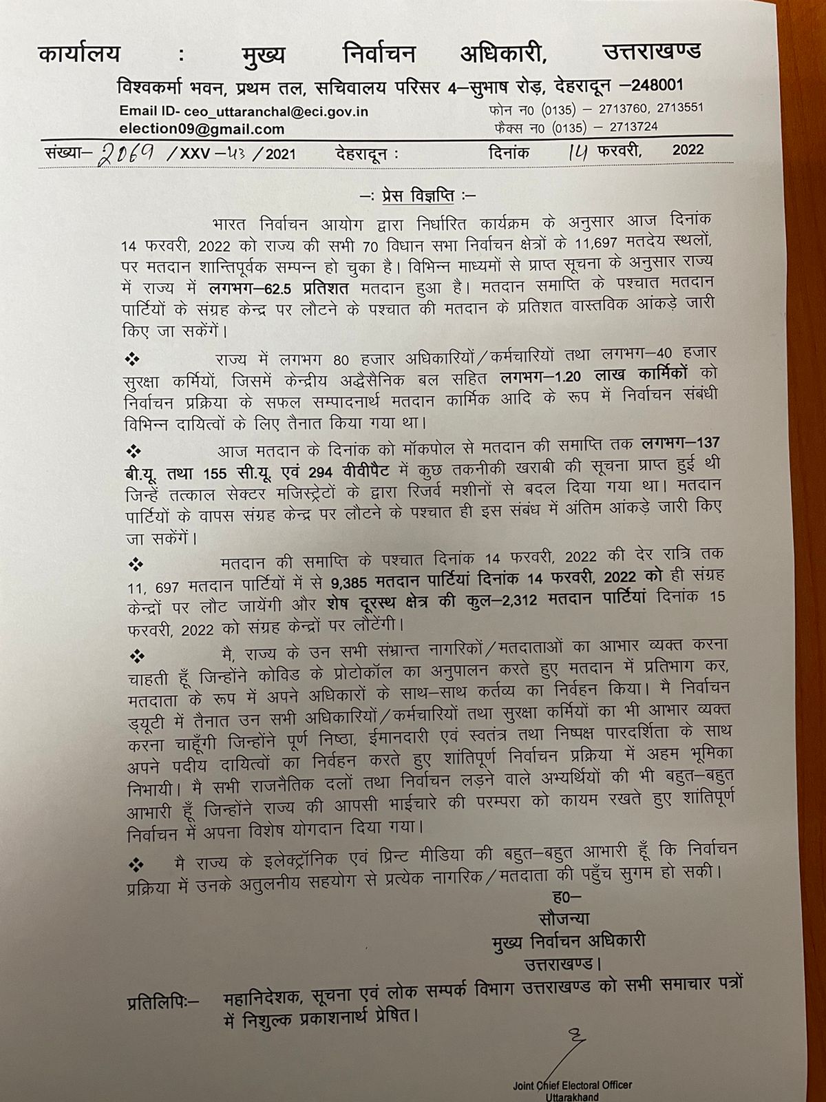 भारत निर्वाचन आयोग द्वारा निर्धारित कार्यक्रम के अनुसार आज दिनांक 14 फरवरी, 2022 को राज्य की सभी 70 विधान सभा निर्वाचन क्षेत्रों के 11,697 मतदेय स्थलों, पर मतदान शान्तिपूर्वक सम्पन्न हो चुका है। विभिन्न माध्यमों से प्राप्त सूचना के अनुसार राज्य में राज्य में लगभग 62.5 प्रतिशत मतदान हुआ है। मतदान समाप्ति के पश्चात मतदान पार्टियों के संग्रह केन्द्र पर लौटने के पश्चात की मतदान के प्रतिशत वास्तविक आंकड़े जारी किए जा सकेंगें।