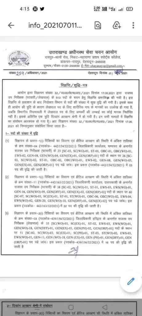 उत्तराखंड में बेरोजगारों के लिए अच्छी खबर है। सरकार ने राजस्व उप निरीक्षक ( पटवारी / लेखपाल ) के 513 पदों के चयन हेतु विज्ञप्ति प्रकाशित की गयी है । इस विज्ञप्ति के प्रकाशन के बाद नियोक्ता विभाग से पदों की संख्या में कुछ वृद्धि की गयी है । इसके साथ ही आयोग की त्रुटि के कारण लेखपाल पद के लिए शारीरिक माप के मानकों का उल्लेख हो गया है , जबकि विभागीय नियमावली में लेखपाल पद के लिए अभ्यर्थी की लम्बाई का कोई मानक निर्धारित नहीं है । इसके अतिरिक एक त्रुटि दिव्यांग आरक्षण श्रेणी में हो गयी है । इन सभी मामलों में विज्ञप्ति का संशोधन आवश्यक हो गया है