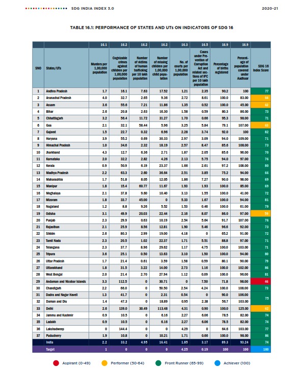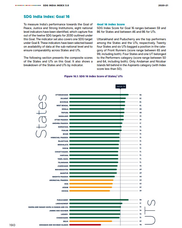 नीति आयोग ने सतत विकास लक्ष्यों के लिए सूचकांक (एसडीजी) इंडिया सूचकांक 2020-21 की रिपोर्ट जारी कर दी है। एसडीजी रिपोर्ट के शीर्षक 16- में कानून एवं शान्ति व्यवस्था, न्याय एवं सुदृढ़ संस्थानों के विकास को महत्व दिया गया है। इसका आंकलन 08 बिन्दुओं के मापदण्ड के आधार पर किया गया है। यह उत्तराखण्ड पुलिस व राज्य के लिए अत्यंत गर्व का विषय है कि इन सभी बिन्दुओं पर बेहतरीन कार्य करते हुए उत्तराखण्ड ने 86 अंकों के साथ इस श्रेणी में शीर्ष स्थान पर अपनी जगह बनाई है। गुजरात दूसरे और मिजोरम तीसरे स्थान पर हैं।