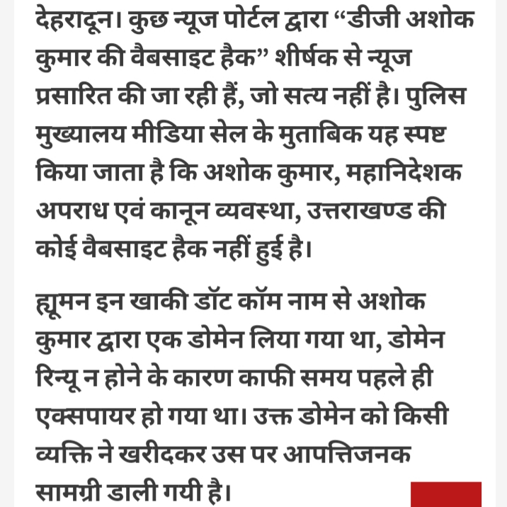 है कि हमारे उत्तराखंड के पुलिस महानिदेशक जी कानून व्यवस्था श्री अशोक कुमार जी की वेबसाइट हैक करते हुए किसी ने उस पर आपत्तिजनक सामग्री लोड कर दी ।