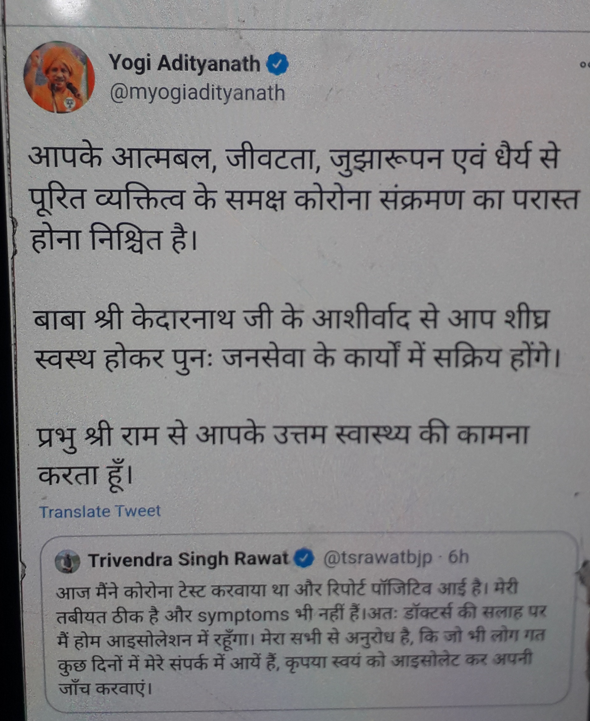 मुख्यमंत्री त्रिवेंद्र कोरोना संक्रमित : उत्तरप्रदेश के मुख्यमंत्री योगी आदित्यनाथ ने त्रिवेंद्र के उत्तम स्वास्थ्य की कामना की ,बोले